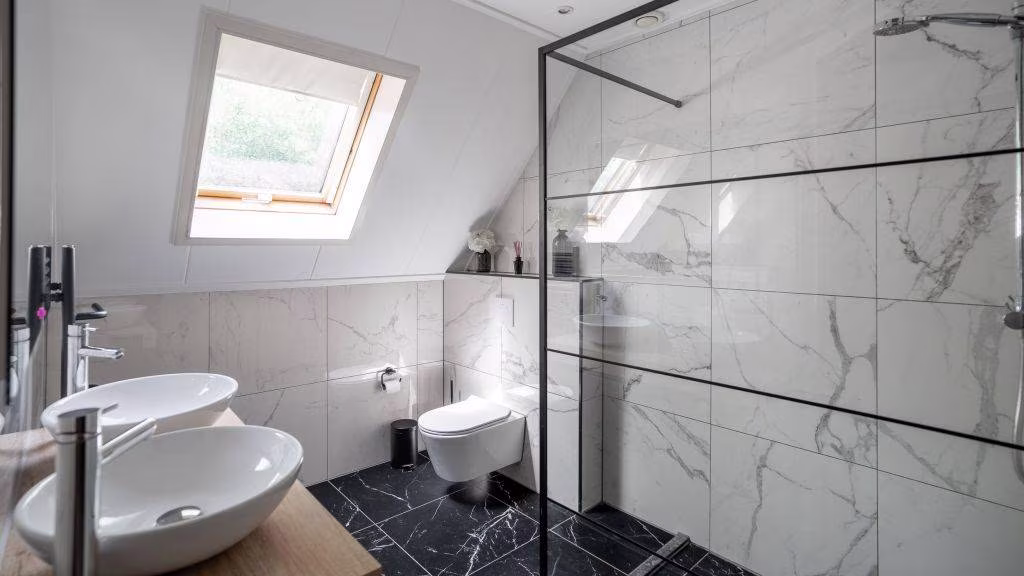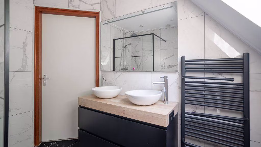 Overloop met toegang tot drie volwaardige slaapkamers waarvan de ouder slaapkamer ruim is. De badkamer is zeer luxe en geschikt over een ruime inloopdouche, 2e toilet en een dubbele wastafel.