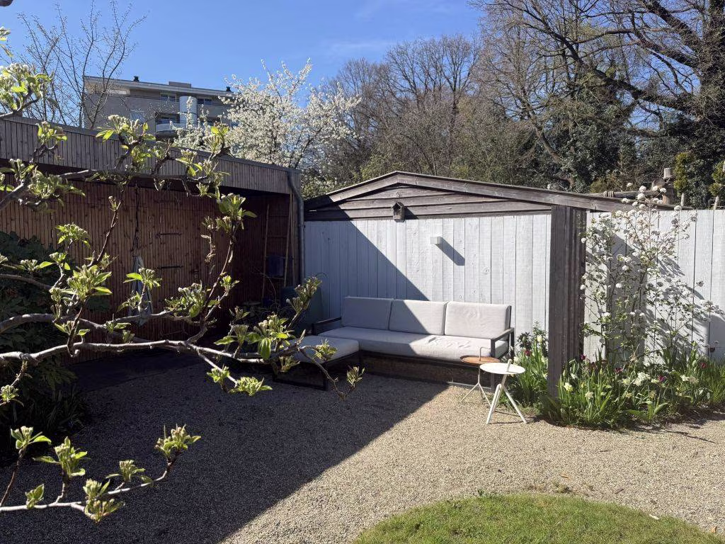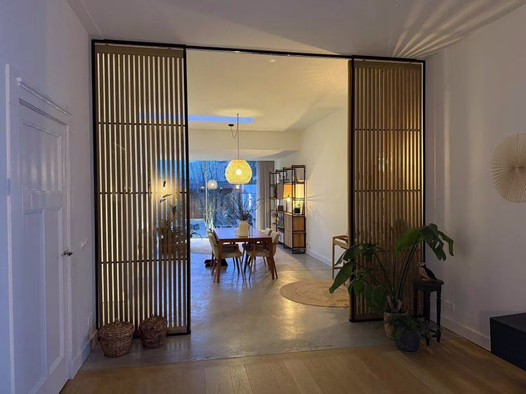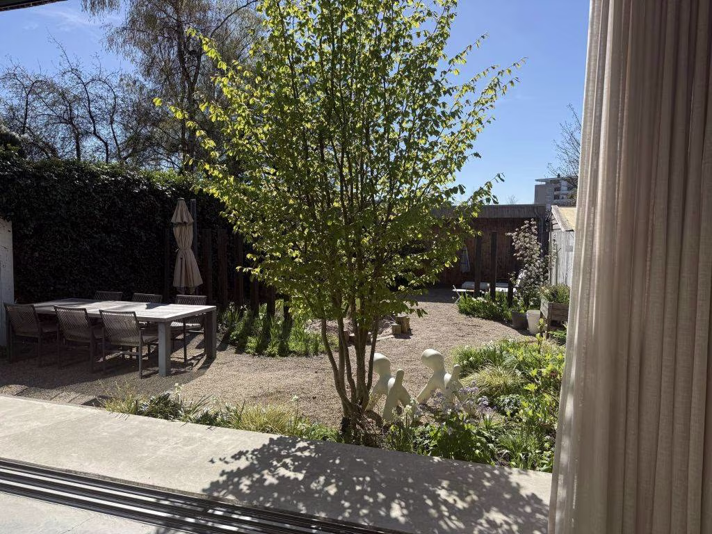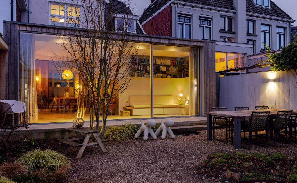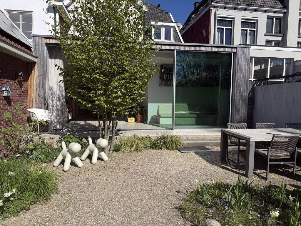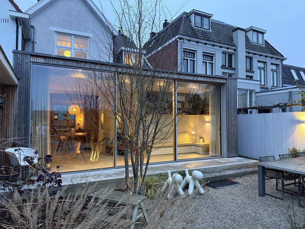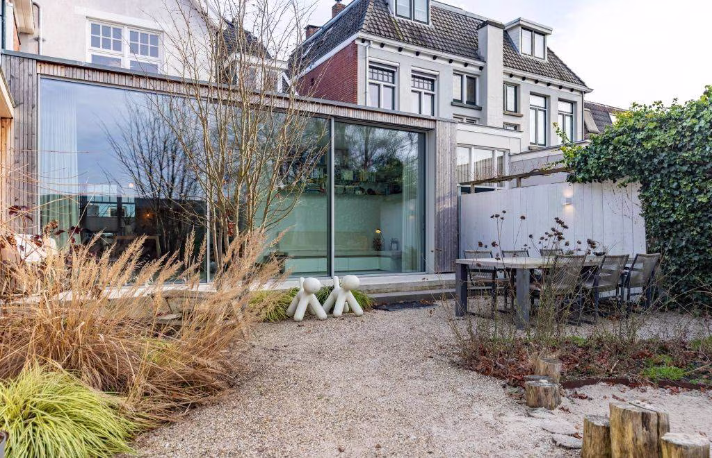 Het effect van de verbouwing is bijzonder: door de glazen pui over de volle breedte kijk je direct naar buiten en wordt je aandacht volledig naar de onder architectuur aangeledge tuin gezogen (Denkers in Tuinen). Niet omdat je moet, maar omdat het glas je uitnodigt. De seizoenen doen hier gewoon mee in huis. Regen tikt zichtbaar tegen de pui, zonlicht schuift langzaam over de vloer, en op zomerdagen zet je alles open en verdwijnt de grens tussen binnen en buiten volledig. Dit is geen achtertuin meer — dit is een verlengde woonkamer.