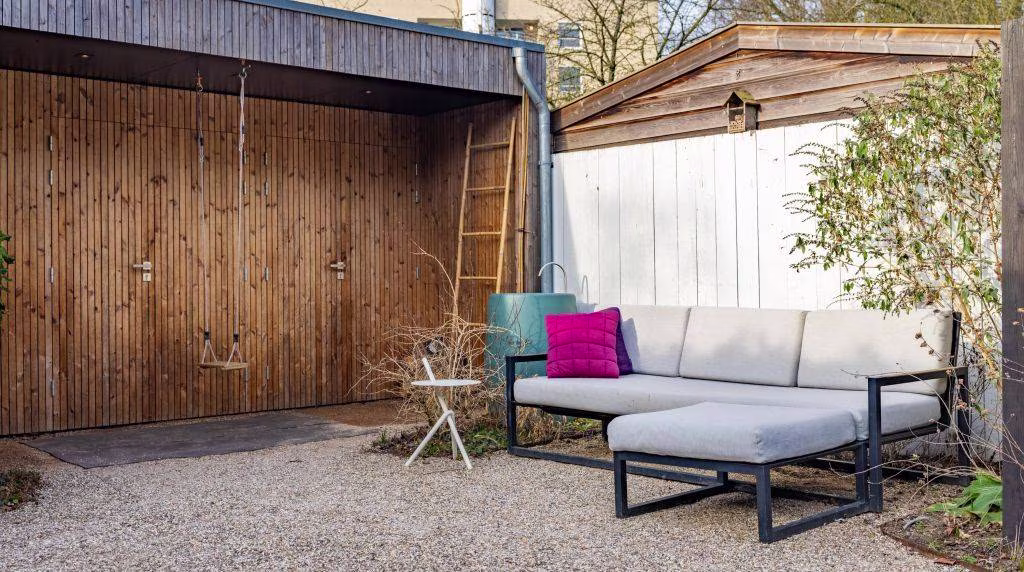 - De berging in de achtertuin is modern vormgegeven, ook door Sabi Architectuur, en match daarmee op een fijne manier met de uitbouw van de woning. De berging bestaat uit verschillende segmenten, waarbij 1 van de delen geschikt zou kunnen zijn voor een thuiswerkplek.