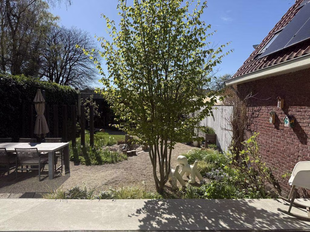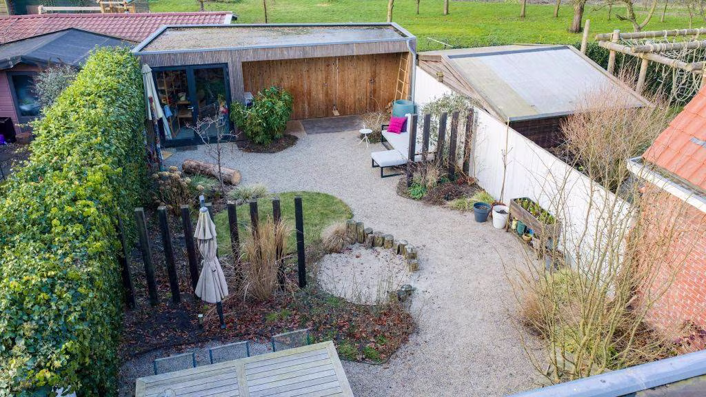 - De achtertuin is aangelegd onder tuinarchitectuur door ontwerpduo Denkers in Tuinen. De tuin is bijzonder aangelegd en ‘leeft’; er is veel biodiversiteit en veel bloeiers, die afwisselend van elkaar heel het seizoen bloeien. Vogeltjes, vlinders, egels… er zijn veel bewoners die hier hun weg vinden. Er zijn diverse zitplekjes, zowel zon- als schaduw. De bestrating is aangelegd met ‘Achterhoeks padvast’. Dit is half verharding, waardoor water het water zeer goed intergreerd in de bodem. Bovendien geeft het zomers een verkoelend effect.