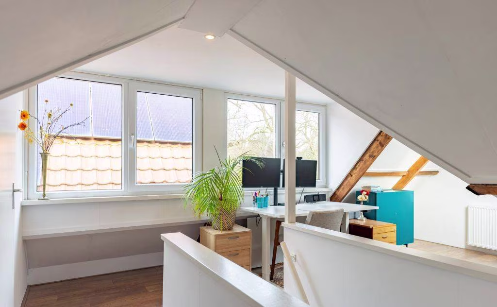 - 2e verdieping: ruime zolder met twee ruimtes. Een slaapkamer en een functionele werkplek. Het is mogelijk om een extra slaapkamer te realiseren.