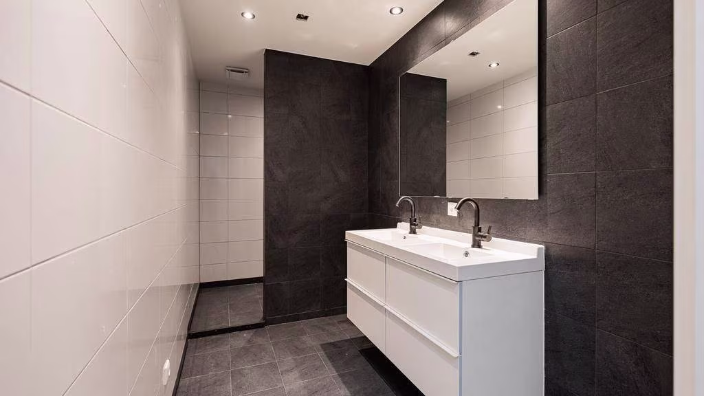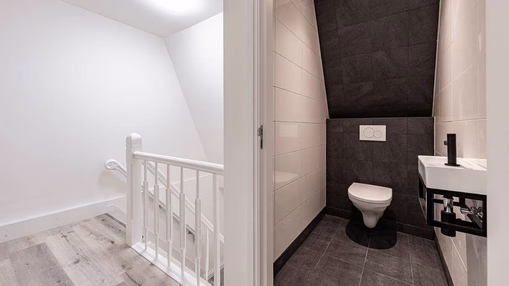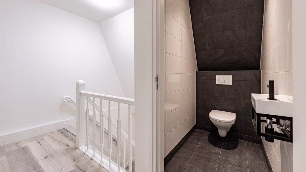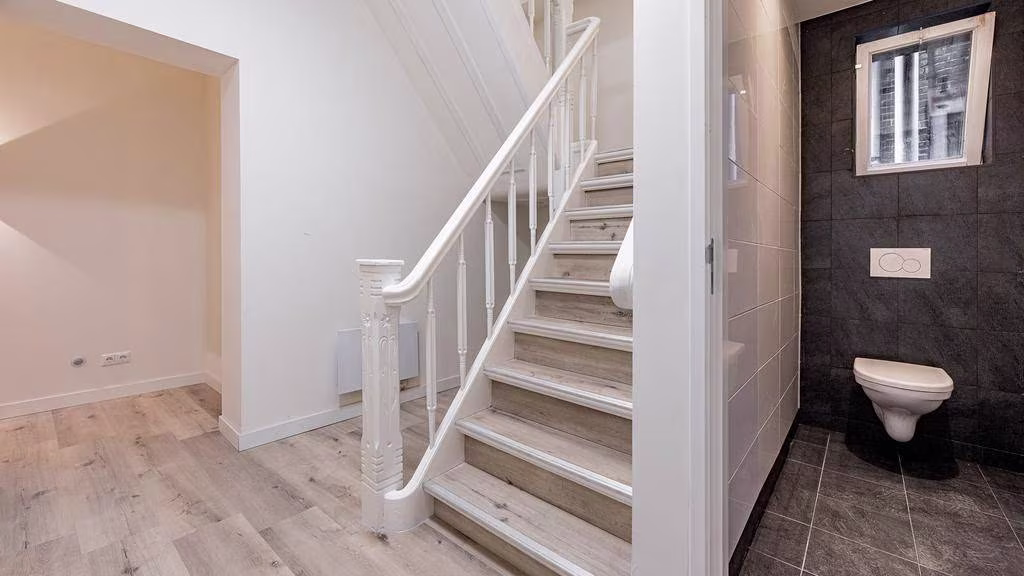 Entree en trap naar de 1e verdieping, badkamer met inloopdouche en dubbele wastafel, berging, toilet met fonteintje en grote woonkamer inclusief leefkeuken.