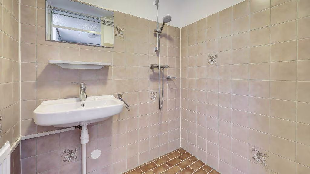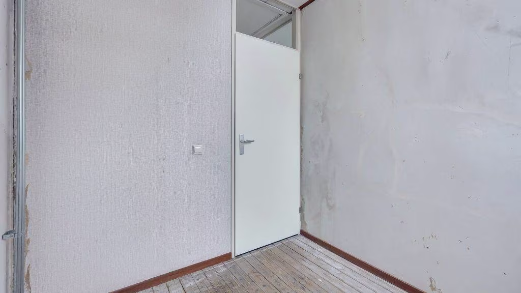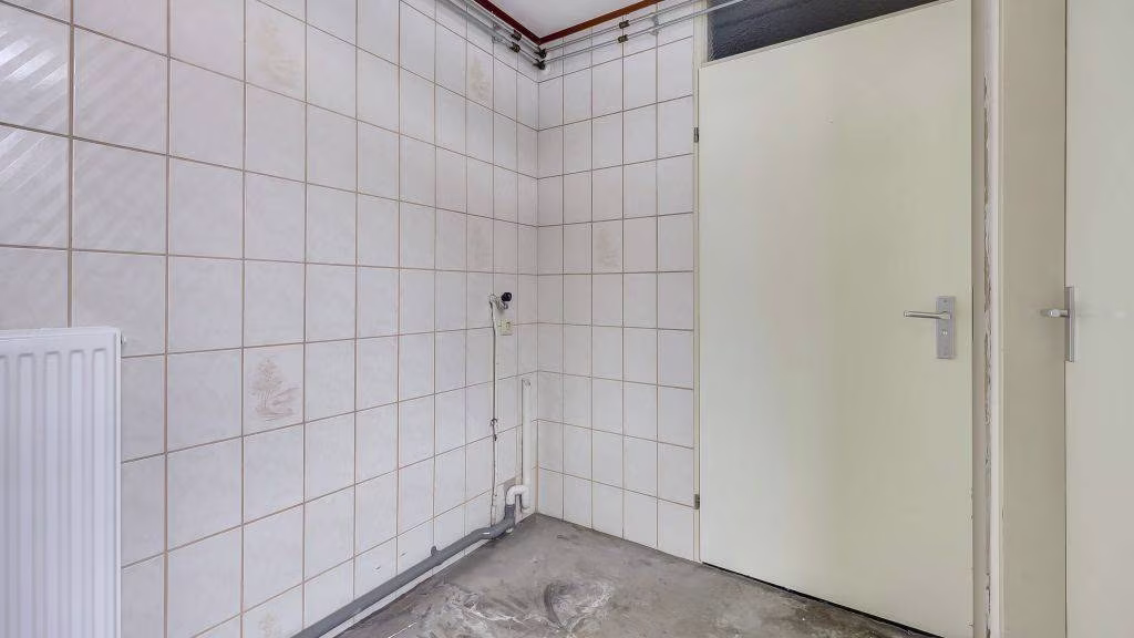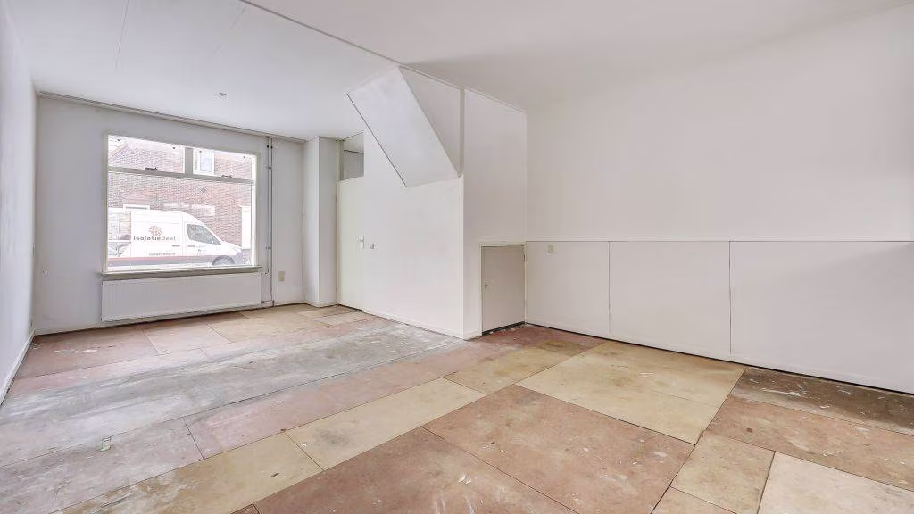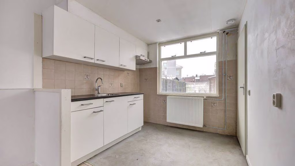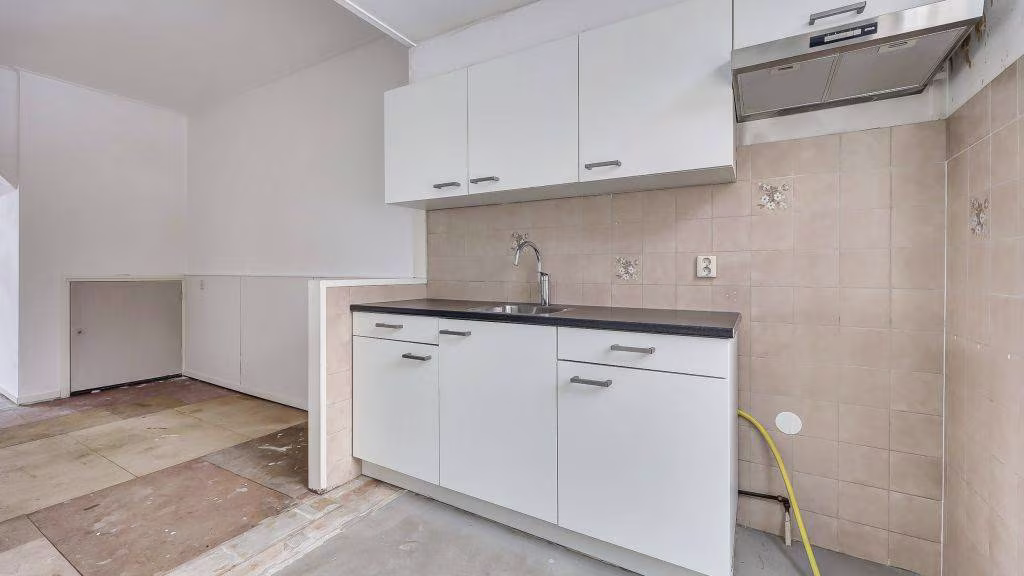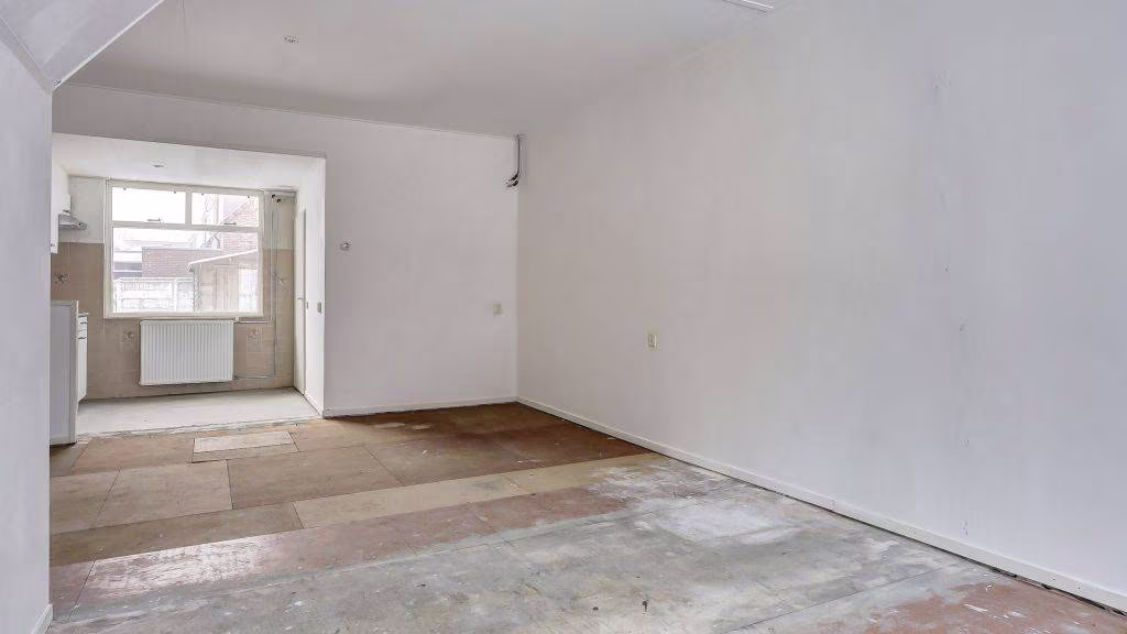 Entree/hal, meterkast en doorgang tot ruime doorzonkamer. Open keuken met verbinding tot achterportaal naar toilet voorzien van fonteintje, badkamer en opstelplaats cv-ketel.