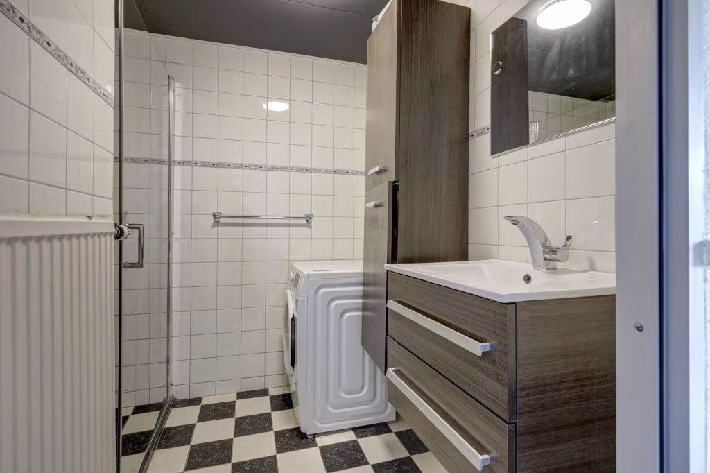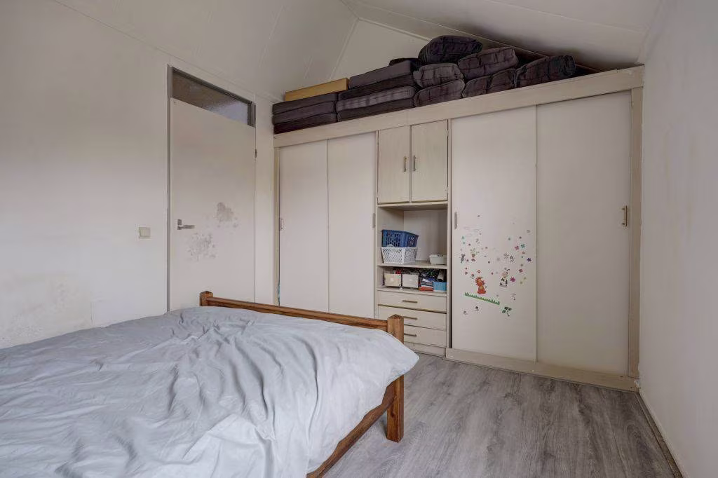 Overloop naar twee royale slaapkamers, vaste kastenwand, vaste kast met opstelplaats cv-ketel, badkamer met douche, wastafelmeubel en opstelplaats witgoedapparatuur.