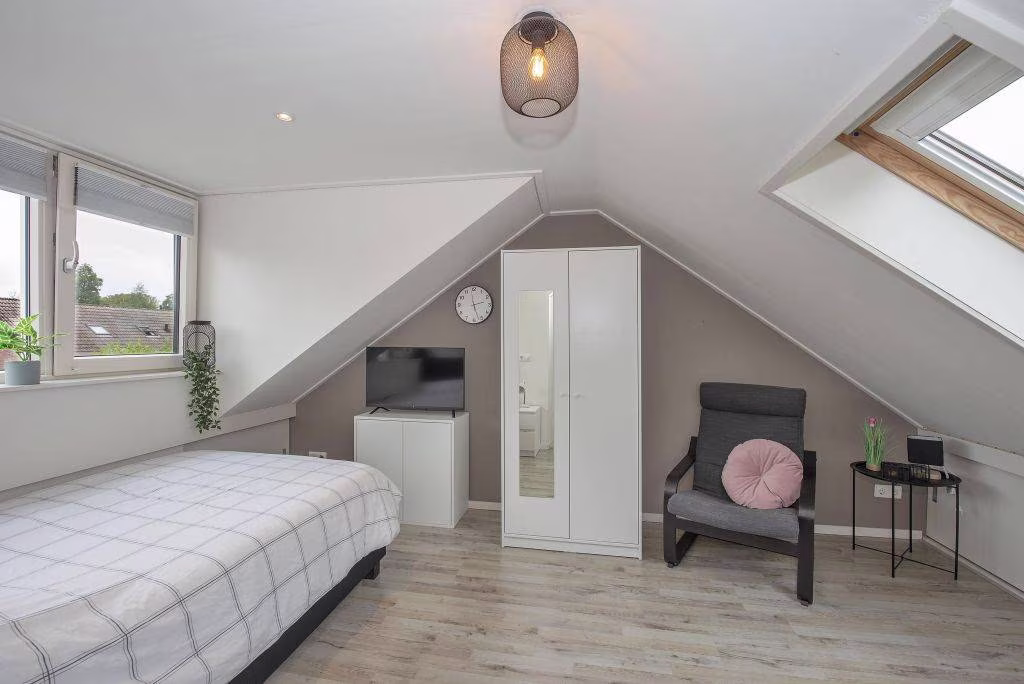 Tweede verdieping: middels vaste trap te bereiken overloop, ruime slaapkamer met dakkapel en dakraam.