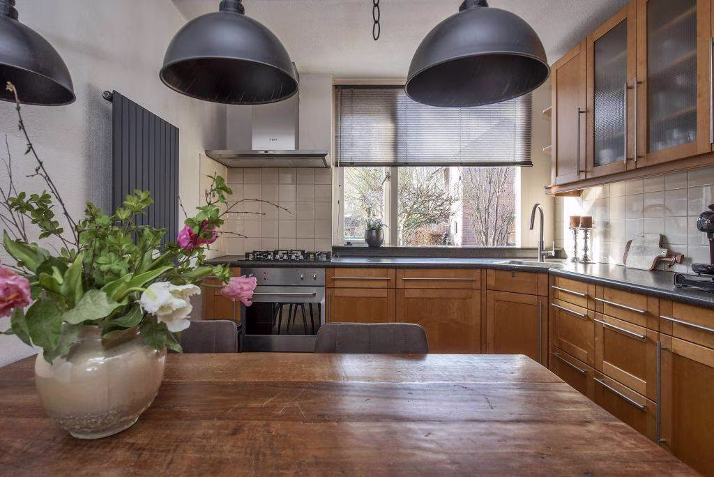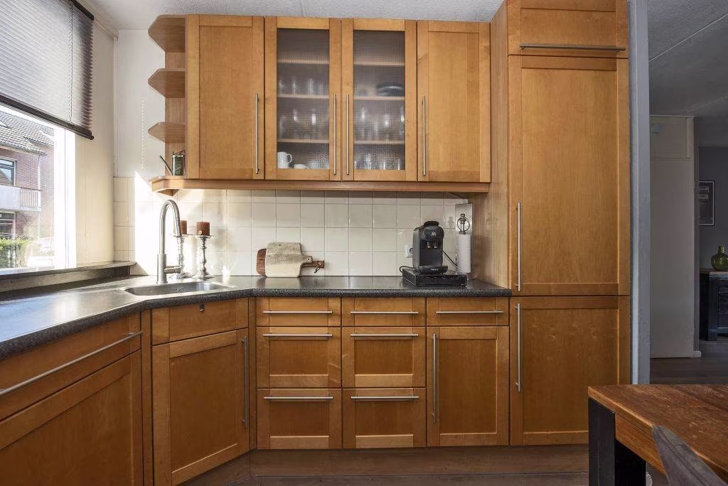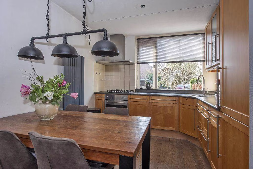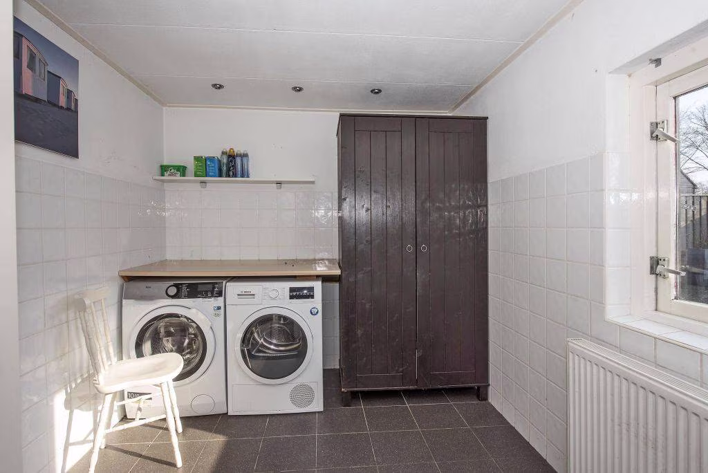 Aan de voorzijde van de woning bevindt zich de keuken. De keukenopstelling dateert uit ongeveer 2000 en is voorzien van diverse inbouwapparatuur, waaronder een kookplaat, afzuigkap, oven, koel vriescombinatie en een vaatwasser. De apparatuur is later vernieuwd rond 2020. Een fijne plek waar koken al snel overgaat in gezellig tafelen. Achter de woonkamer vind je een hal en een praktische bijkeuken die achter elkaar zijn gelegen. Dit zijn ideale ruimtes voor het plaatsen van witgoed, maar zeer zeker ook geschikt als een fijne werkplek of bijvoorbeeld een hobbyplek. De ruimte beschikt over een raam dat open kan. Vanuit hier loop je bovendien zo door naar de tuin.