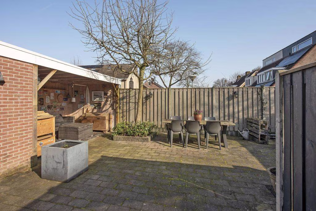 De achtertuin biedt een fijne plek om buiten te zitten en te ontspannen. Dankzij de aanwezige overkapping kun je hier al vroeg in het voorjaar en tot laat in het najaar comfortabel buiten zitten. Een beschutte plek waar je bijvoorbeeld een loungeset, jacuzzi of eettafel kunt plaatsen en waar je lange zomeravonden doorbrengt met familie of vrienden. Door de diepe tuin kun je in de zomer zowel in de zon als de schaduw zitten. Daarnaast beschikt de tuin over meerdere praktische bergingen. Ideaal voor het stallen van fietsen, het opbergen van tuinspullen of gereedschap. En voor de motorliefhebber is er goed nieuws: ook de motor kan hier gewoon een eigen, droge parkeerplek krijgen. Via de aanwezige achterom is de tuin bovendien gemakkelijk bereikbaar.