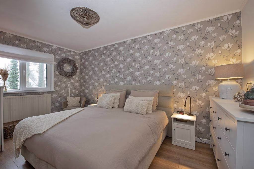 Boven kom je op een overzichtelijke overloop met toegang tot drie slaapkamers en de badkamer. De slaapkamer aan de achterzijde biedt ruim voldoende plek voor een tweepersoonsbed en extra kasten. Aan de voorzijde liggen nog twee slaapkamers die zich uitstekend lenen als slaap-, werk- of hobbykamer. Op de overloop en in een van de kamers vind je bovendien praktische vaste kasten, ideaal voor linnengoed, voorraad of seizoens spullen. De eyecatcher op deze verdieping is de moderne badkamer: volledig betegeld in een stoere, donkere tegel, uitgerust met een ruime inloopdouche met glaswand, een breed wastafelmeubel met twee kranen en plaats voor de wasmachine. Dankzij de strakke afwerking, verlichte spiegel en de spots is dit een comfortabele ruimte waar je dag prettig begint en eindigt.