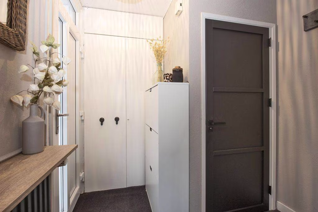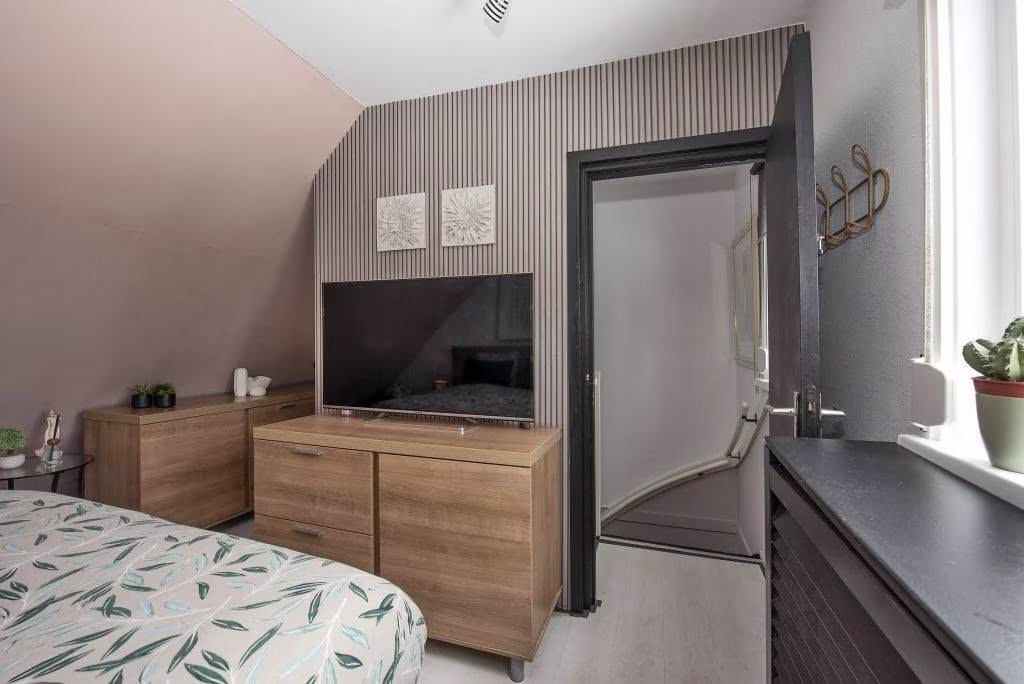 Met de vaste trap kom je op de tweede verdieping waar zich een verrassend ruime kamer bevindt. Het schuine dak geeft de ruimte een knusse sfeer, terwijl het zijraam zorgt voor prettig daglicht en in combinatie met de lichte vloer een ruimtelijk gevoel geeft. Dankzij de aanwezige airco is het hier in de zomer heerlijk koel en in de winter snel op temperatuur. Een fijne extra verdieping, praktisch als slaap-, werk- of logeerkamer.
