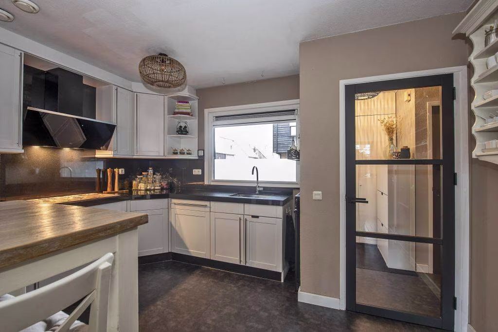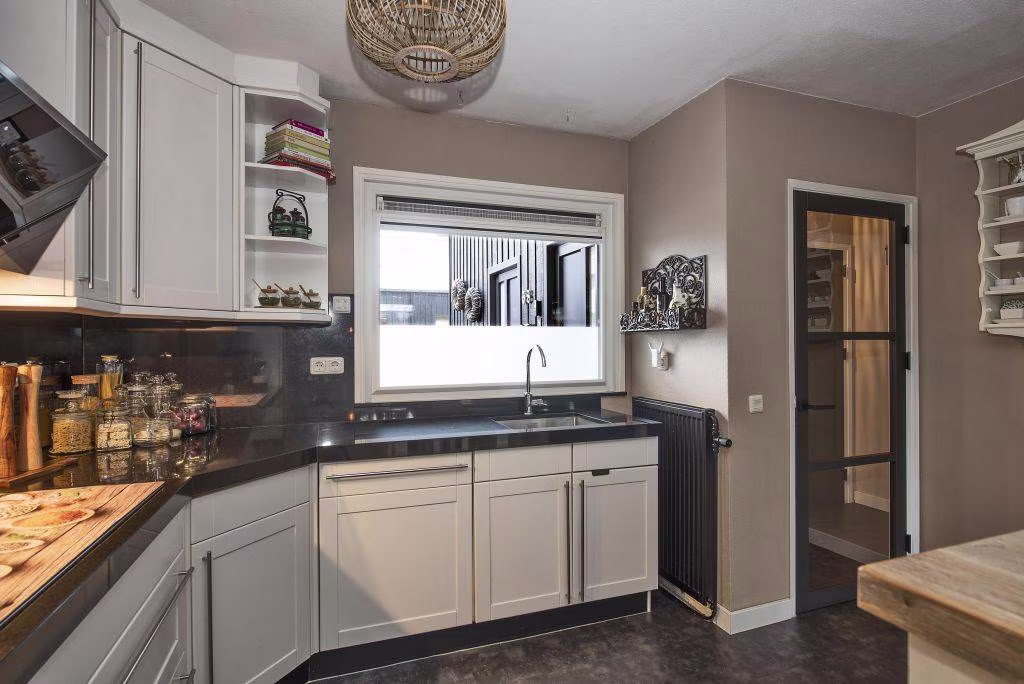 Voor de woning is een oprit, zodat je op eigen terrein kunt parkeren. Aan de voorkant vind je ook de toegang tot de berging, handig voor fietsen en het opbergen van spullen. Achter de voordeur kom je in een verzorgde hal met een modern toilet, de trap naar boven en de meterkast. Het toilet beschikt over een wandcloset, fontein en is betegeld met grote, eigentijdse tegels. Aan de straatzijde ligt de keuken: een ruime hoekopstelling met strakke fronten en een donker werkblad. Hier bevindt zich ook een praktische trapkast, ideaal voor voorraad en alle spullen die je uit het zicht wilt opbergen. De keuken is voorzien van inbouwapparatuur, waaronder een kookplaat, afzuigkap, koel-vriescombinatie en een vaatwasser. Dankzij de opening in de wand tussen keuken en woonkamer heb je leuk contact met elkaar en komt er extra daglicht binnen. Via de boogdoorgang loop je de woonkamer in, met ruim voldoende plek voor een eettafel en zitplek. De houten vloer, de sfeervolle haard, sierlijsten aan het plafond en de grote raampartij met tuindeur geven deze ruimte een warme uitstraling. Deze combinatie maakt het een prettige plek om te eten en te ontspannen, met vrij zicht op de achtertuin.