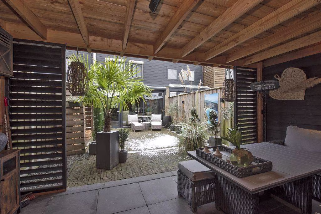 Achter de woning ligt een verzorgd aangelegde tuin die helemaal in het teken staat van ontspannen. Direct achter de woonkamer stap je het terras op, waar de bestrating zorgt voor een onderhoudsarme basis met genoeg ruimte voor een tuinset. Achterin de tuin staat een royale overkapping, een sfeervolle plek om het hele jaar door buiten te zitten. De schuttingen en de bomen direct achter de tuin geven privacy en een beschut gevoel, waardoor dit al snel je favoriete verlengstuk van de woonkamer wordt.