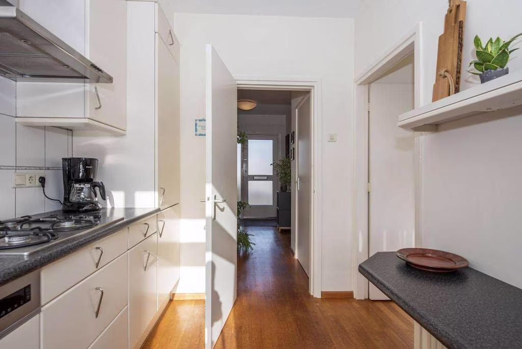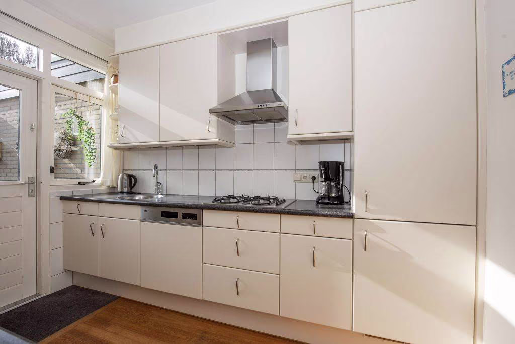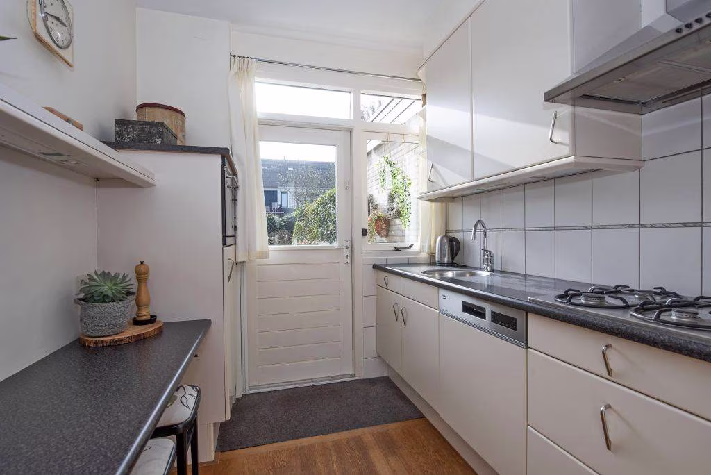 Aan de achterzijde van de woning bevindt zich de keuken. De keuken is functioneel en praktisch ingedeeld en biedt uitzicht op de achtertuin.