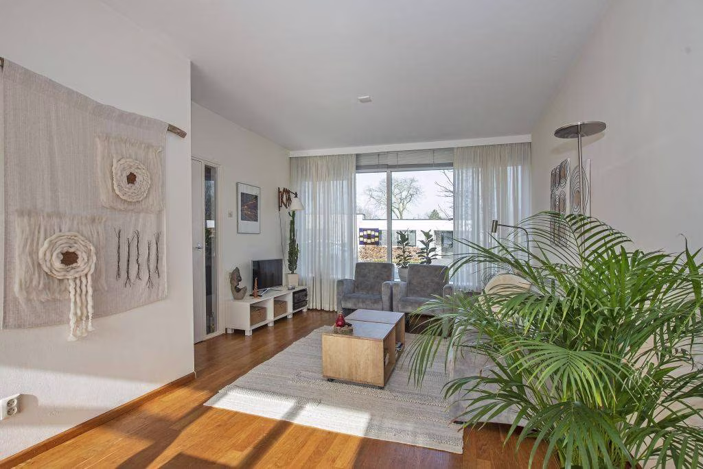 De woonkamer biedt voldoende ruimte voor een comfortabele zithoek én een gezellige eethoek.