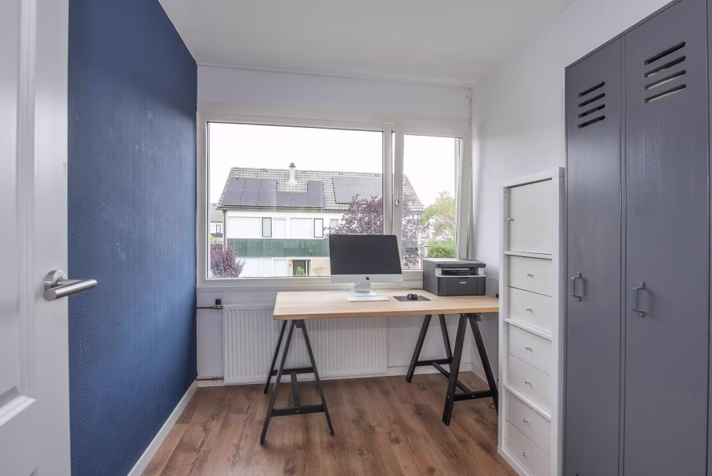 2e verdieping: via vaste trap bereikbare overloop met wastafel, bergkast (thans in gebruik als kledingkast), 2e bergruimte met dakraam en cv-opstelling, ruime, goed afgewerkte en geïsoleerde 4e slaapkamer voorzien van zijraam.