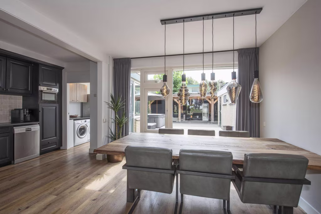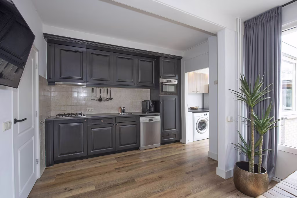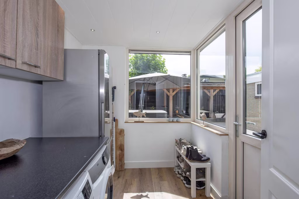 - Inbouwapparatuur keuken: 4-pits gaskookplaat, afzuigkap, vaatwasser, combi-oven/magnetron en koelkast;