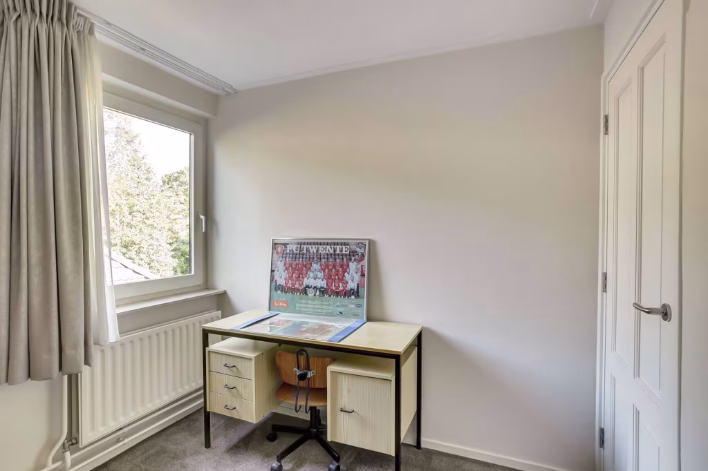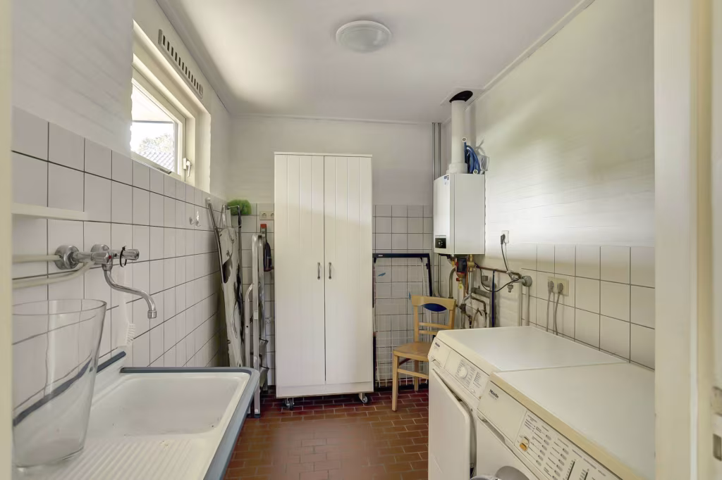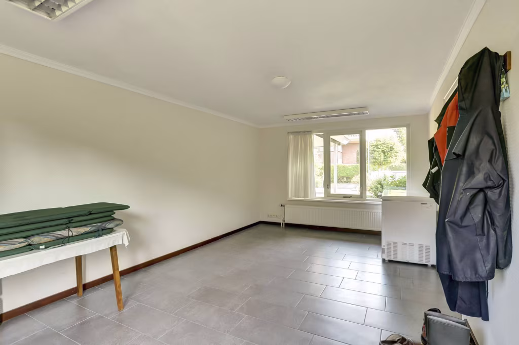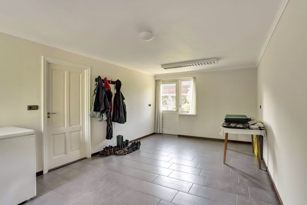 Via de zijentree bereik je een hal met toegang tot de keuken, bijkeuken (met wasmachine- en drogeraansluiting), de achtertuin en een royale kantoor-/hobbyruimte. Deze multifunctionele ruimte kan perfect dienst doen als kantoor, maar ook worden ingericht als extra slaapkamer met badkamer op de begane grond.