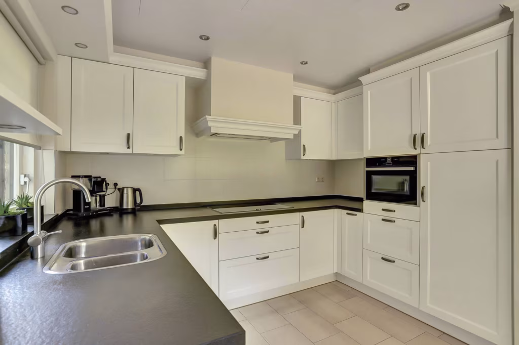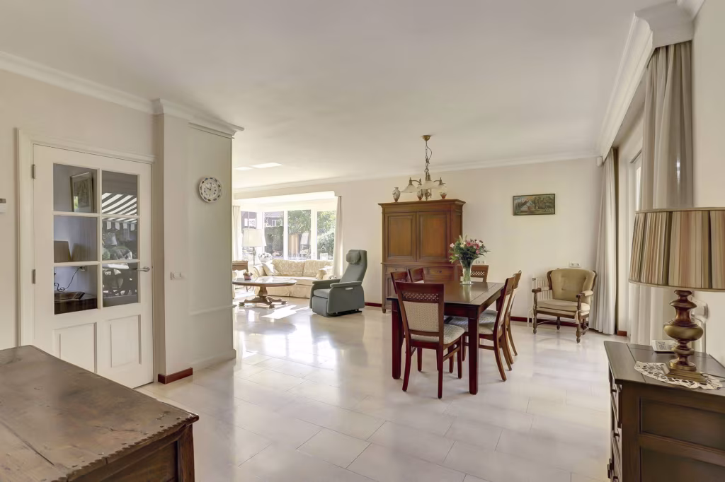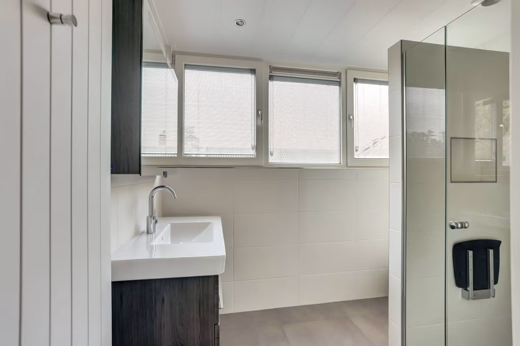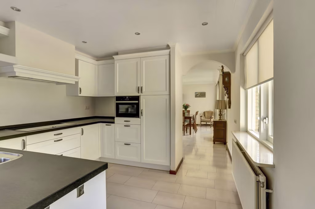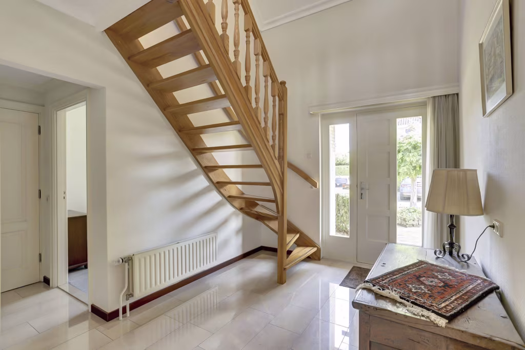 Via de zijentree bereik je een hal met toegang tot de keuken, bijkeuken (met wasmachine- en drogeraansluiting), de achtertuin en een royale kantoor-/hobbyruimte. Deze multifunctionele ruimte kan perfect dienst doen als kantoor, maar ook worden ingericht als extra slaapkamer met badkamer op de begane grond.