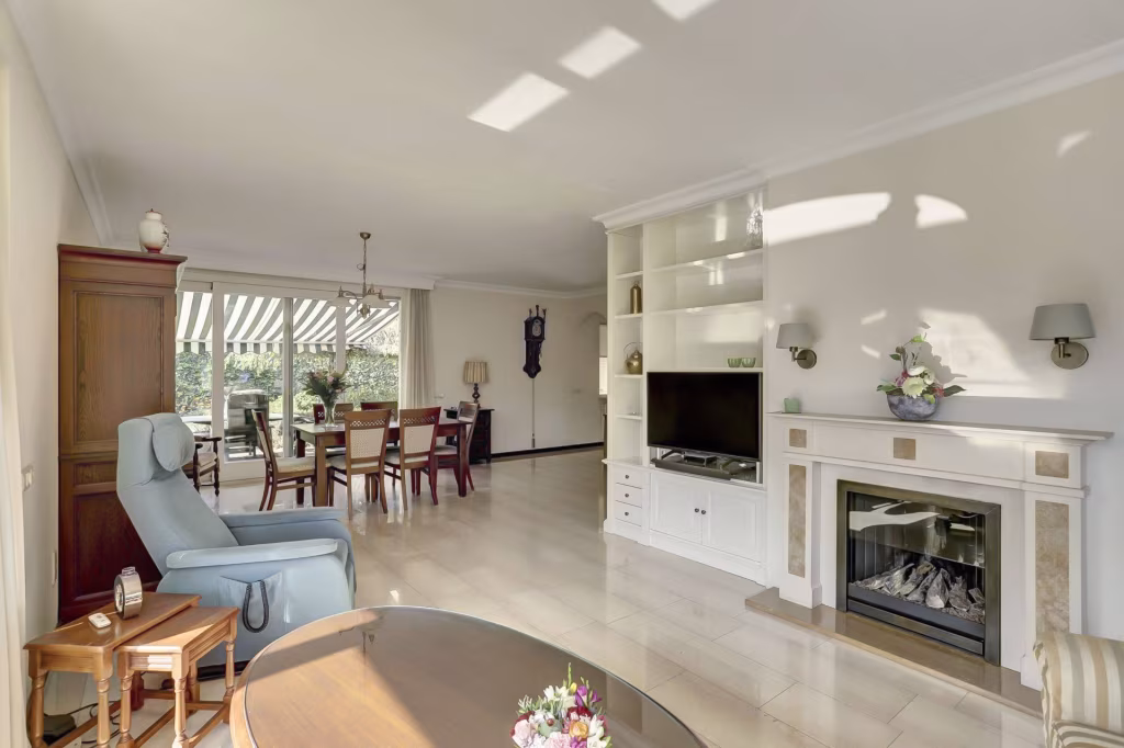 Via de ruime entree met vide betreed je de woning. De hal geeft toegang tot de trapopgang, een extra (slaap)kamer aan de voorzijde, de toiletruimte en de royale woonkamer. Deze lichte woonkamer beschikt over een sfeervolle haard, een erker aan zowel de voor- als zijkant en een schuifpui naar het zonneterras en de tuin. De halfopen keuken, gesitueerd aan de achterzijde, is modern uitgevoerd en voorzien van diverse inbouwapparatuur.