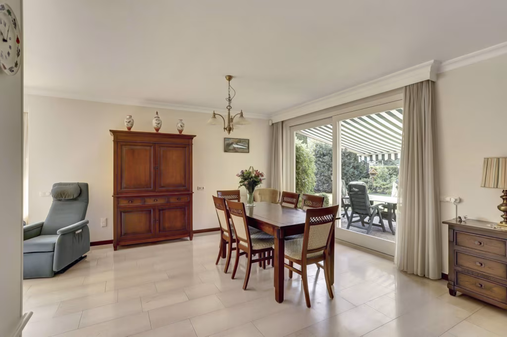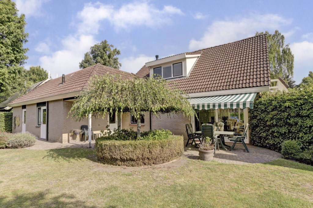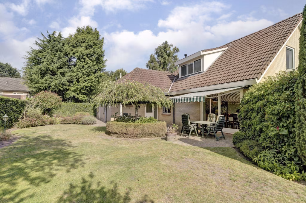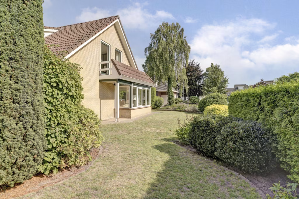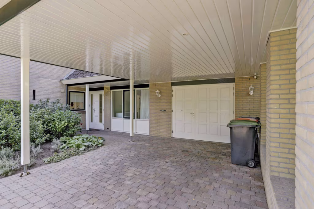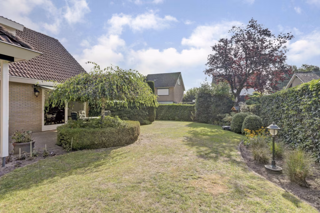 Rondom de woning ligt een fraai aangelegde tuin met een zonnig terras en volop privacy. Het geheel biedt een mooie balans tussen groene borders en gazon. Daarnaast is er een handige achterom aanwezig. Aan de voorzijde beschikt de woning over een royale oprit met carport en ruimte voor meerdere auto’s.