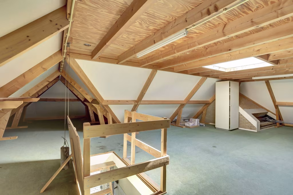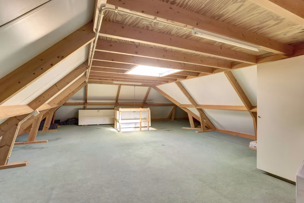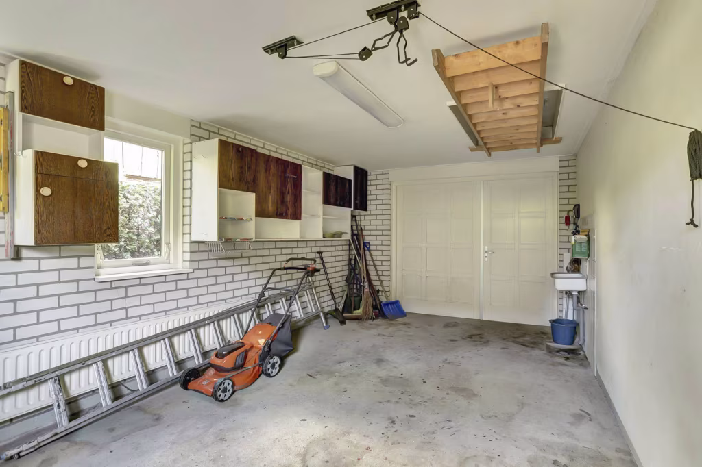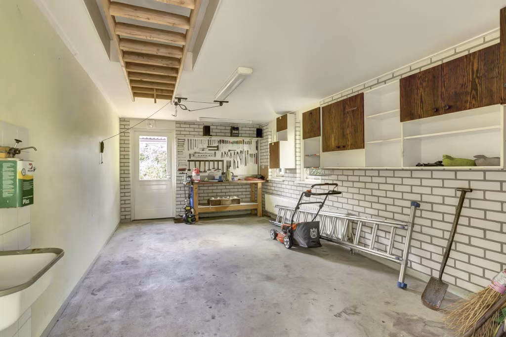 Verder vind je op de begane grond een ruime garage met openslaande deuren en een grote zolder met daklicht (ca. 40 m²), die naar wens is in te delen of als bergzolder kan worden gebruikt.