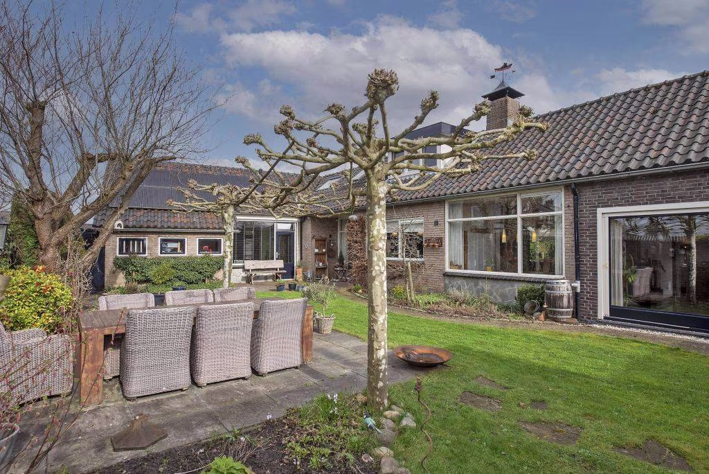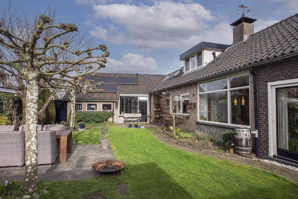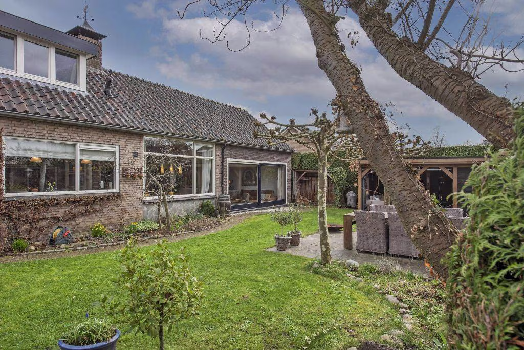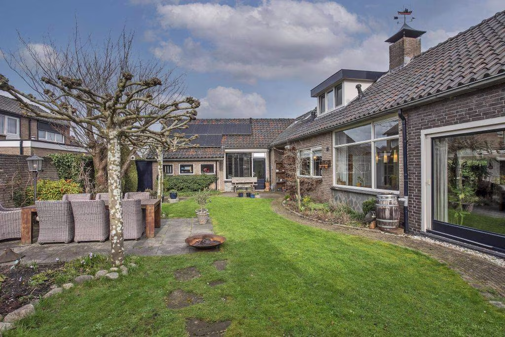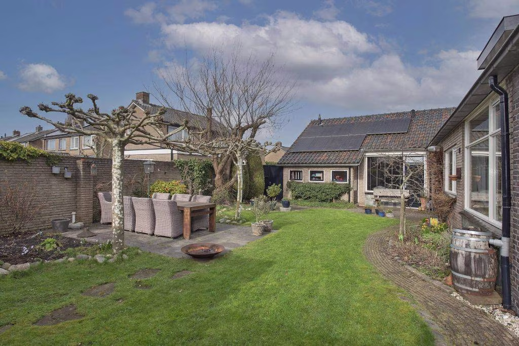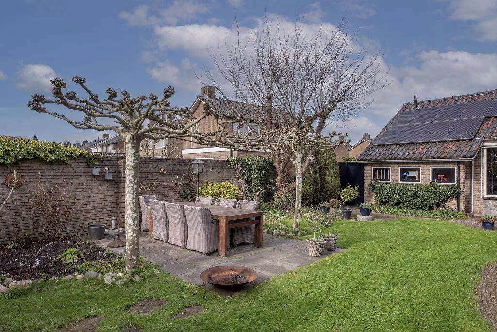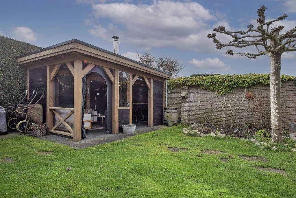 De woning beschikt over een ruime tuin waar je volop kunt genieten van het buitenleven. Dankzij het vele groen voelt de tuin prettig beschut. Achter in de tuin staat een fraaie overkapping met houtkachel, een heerlijke plek waar je beschut kunt zitten en waar je al vroeg in het voorjaar en tot laat in het najaar buiten kunt genieten. Via de achterom kom je op de eigen oprit, waar plaats is voor maar liefst twee auto's. Vanuit hier heb je direct toegang tot de royale garage. Deze ruimte is ideaal voor de auto, fietsen of extra opslag en biedt bovendien toegang tot een praktische wasruimte, wat zorgt voor extra gemak in het dagelijks gebruik.