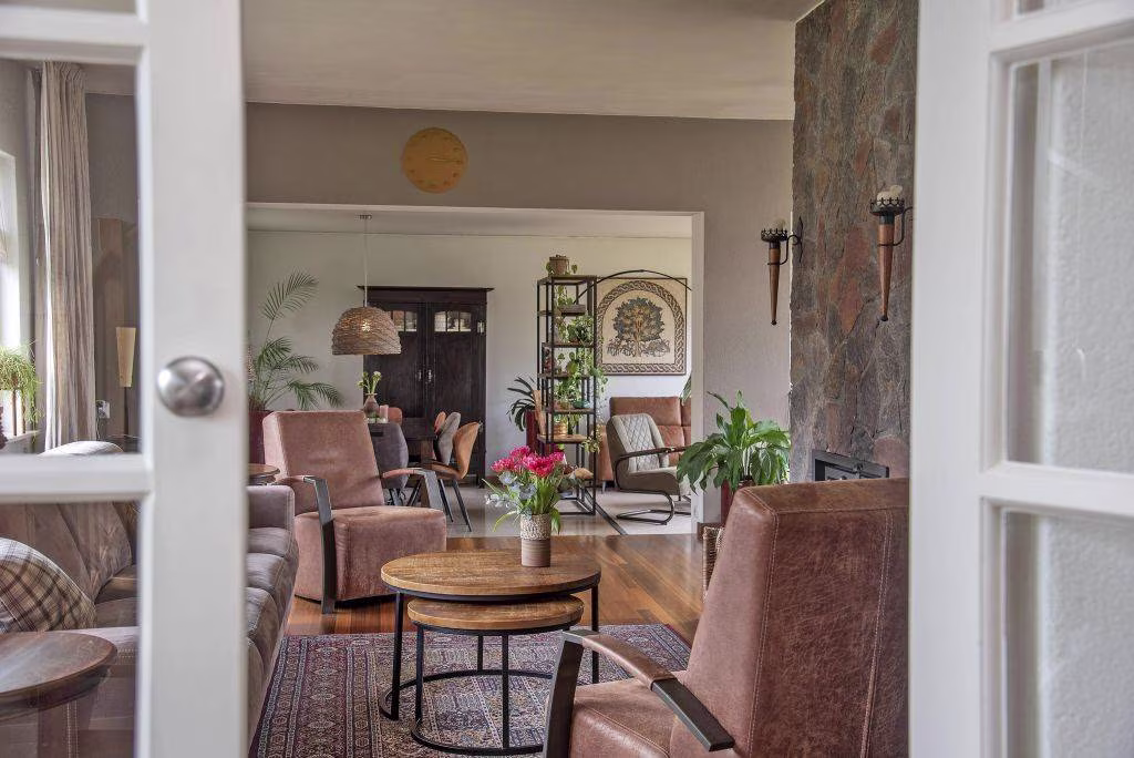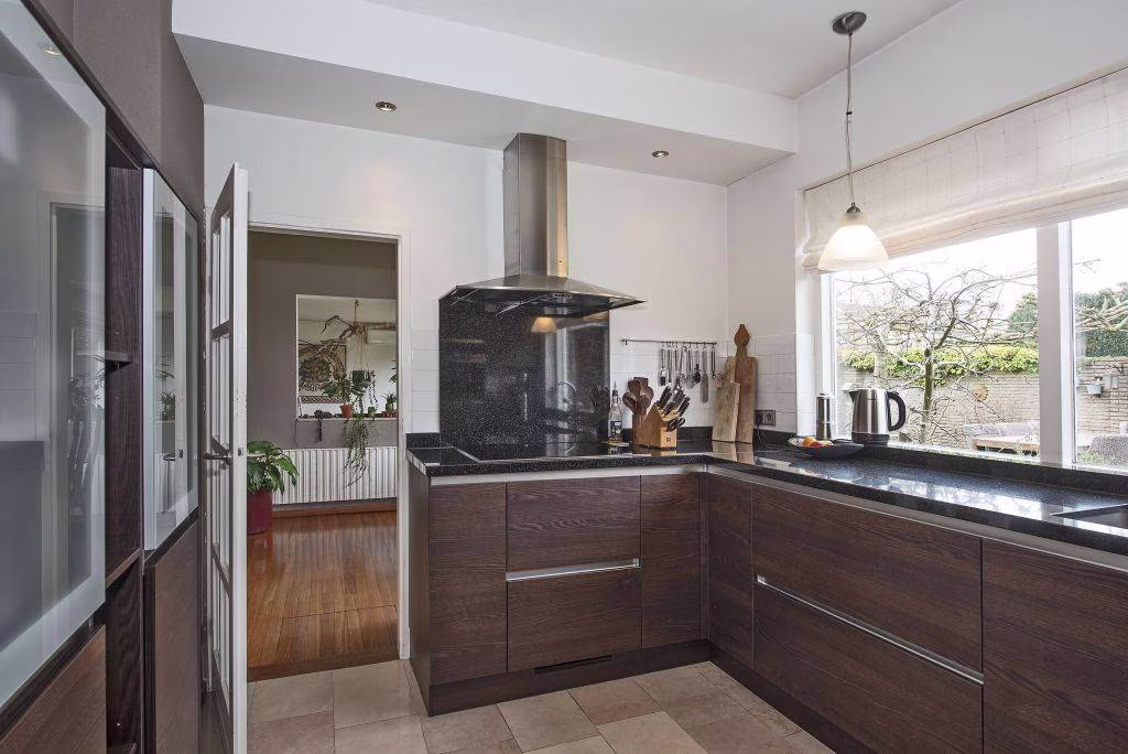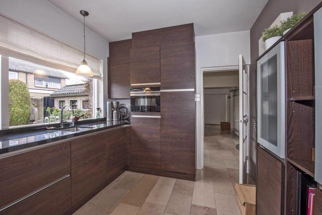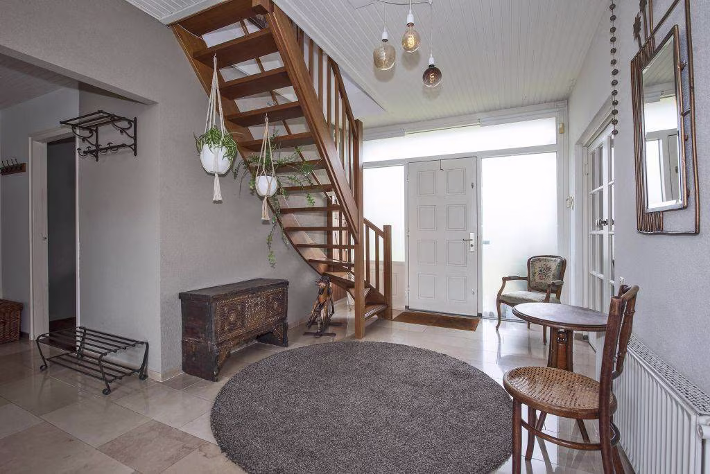 Via de entree kom je binnen in een ruime hal, met toilet en trap naar boven. Deze hal vormt het centrale punt van de woning en verdeelt het huis op een praktische manier in twee delen. Aan de ene zijde van de hal bevindt zich het leefgedeelte. Hier vind je de royale woonkamer met grote ramen die uitzicht geven op de tuin en zorgen voor veel daglicht. De ruimte biedt volop indelingsmogelijkheden. Zo is er een tweede zithoek rondom de sfeervolle open haard, waar je op koudere dagen heerlijk kunt zitten. Daarnaast is er meer dan genoeg ruimte voor een grote eettafel, een fijne plek om samen te eten of lange avonden na te tafelen. De moderne keuken sluit hier mooi op aan en is voorzien van diverse inbouwapparatuur, waaronder een inductiekookplaat, afzuigkap, combi-oven, vaatwasser, koelkast en vriezer, waardoor je hier van alle gemakken bent voorzien.