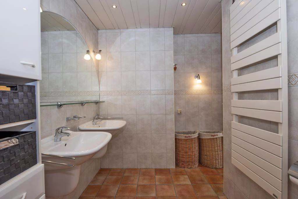 Aan de andere zijde van de hal bevindt zich het slaapgedeelte van de woning. In deze gang bevinden zich een separaat toilet en een handige voorraadkast. Vanuit deze gang zijn drie ruime slaapkamers bereikbaar. Twee van deze slaapkamers beschikken over een aangrenzende badkamer. Er is één badkamer met douche, ligbad, dubbele wastafel en toilet. De tweede badkamer heeft een douche en een wastafelmeubel. De master bedroom beschikt daarnaast over een ruime inloopkast, ideaal voor kleding en extra bergruimte.