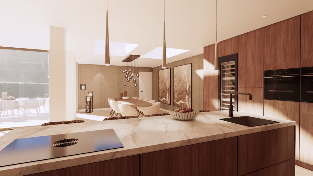 De woonkamer is echt het hart van het huis: een lichte en royale leefruimte met open haard en een fraaie serre/tuinkamer met twee lichtkoepels. Dankzij de schuifpui sta je in directe verbinding met de tuin, die gunstig op het zuiden is gelegen, waardoor je hier optimaal van de zon kunt genieten en binnen en buiten mooi in elkaar overlopen.