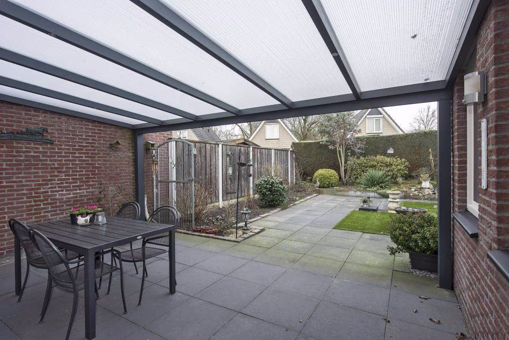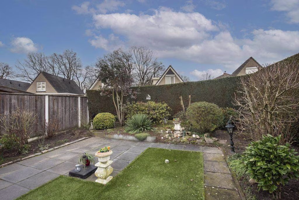 Vanuit het achter portaal bereik je de achtertuin, waar direct de ruime veranda opvalt. Deze overkapping biedt een beschutte plek om vroeg in het voorjaar en tot laat in het najaar buiten te zitten, met genoeg ruimte voor een eettafel of een loungeset. De tuin zelf is sfeervol en praktisch aangelegd met bestrating, een groen gazon accent en gevarieerde beplanting langs de randen. De hoge erfafscheiding, bestaande uit een schutting en een dichte haag zorgt voor veel privacy, zodat je hier in alle rust buiten kunt genieten.