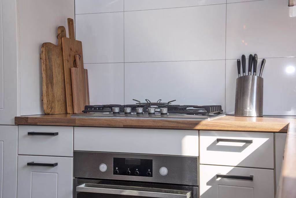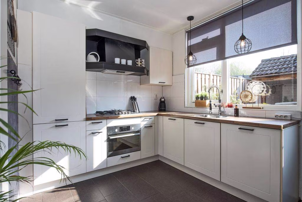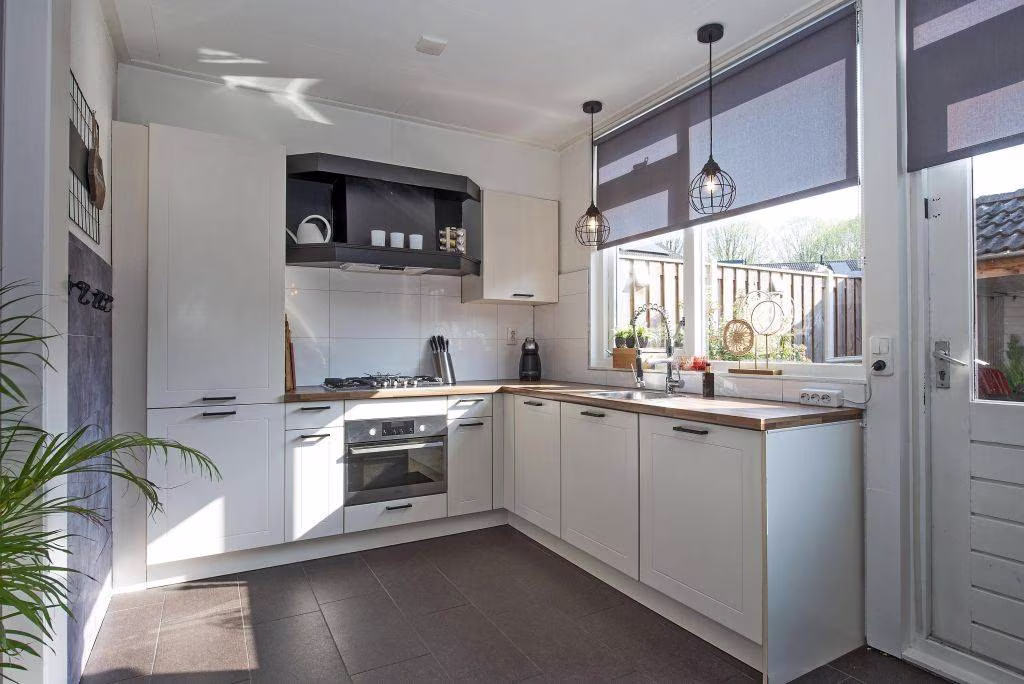 De keuken is praktisch ingericht, voorzien van diverse inbouwapparatuur en biedt uitzicht op de tuin. Een plek waar koken en samen zijn vanzelf samenkomen. De basis is goed en biedt tegelijkertijd ruimte om het geheel naar eigen smaak in te richten.
