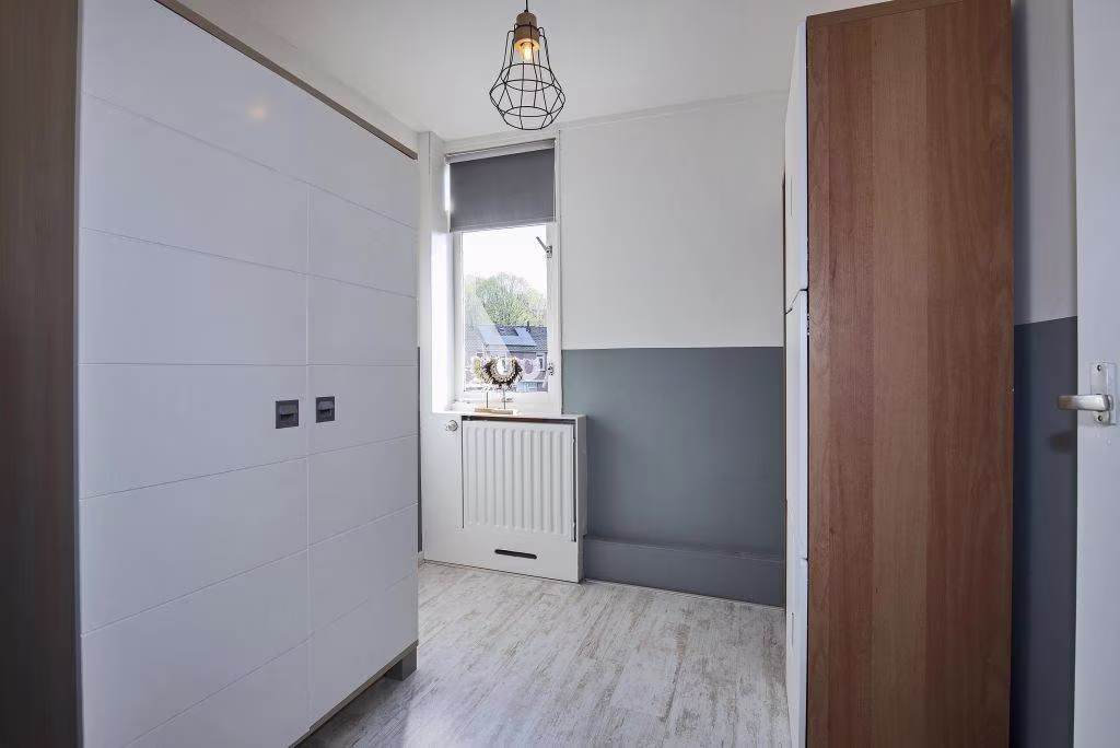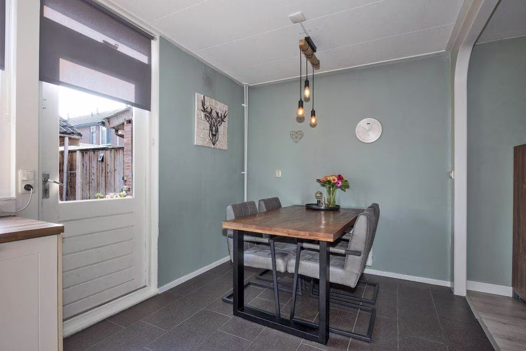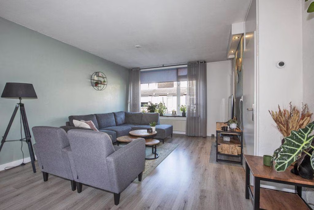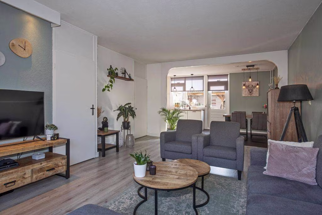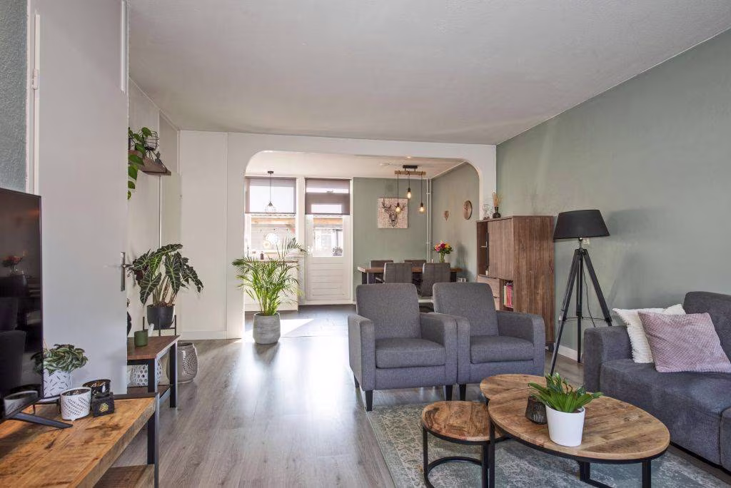 Je komt binnen in een overzichtelijke woning waar alles op een natuurlijke manier in elkaar overloopt. De woonkamer is gelegen aan de voorzijde en is een prettige plek om thuis te komen. De ruimte voelt licht en functioneel, met voldoende plek voor zowel een zithoek als een eettafel.
