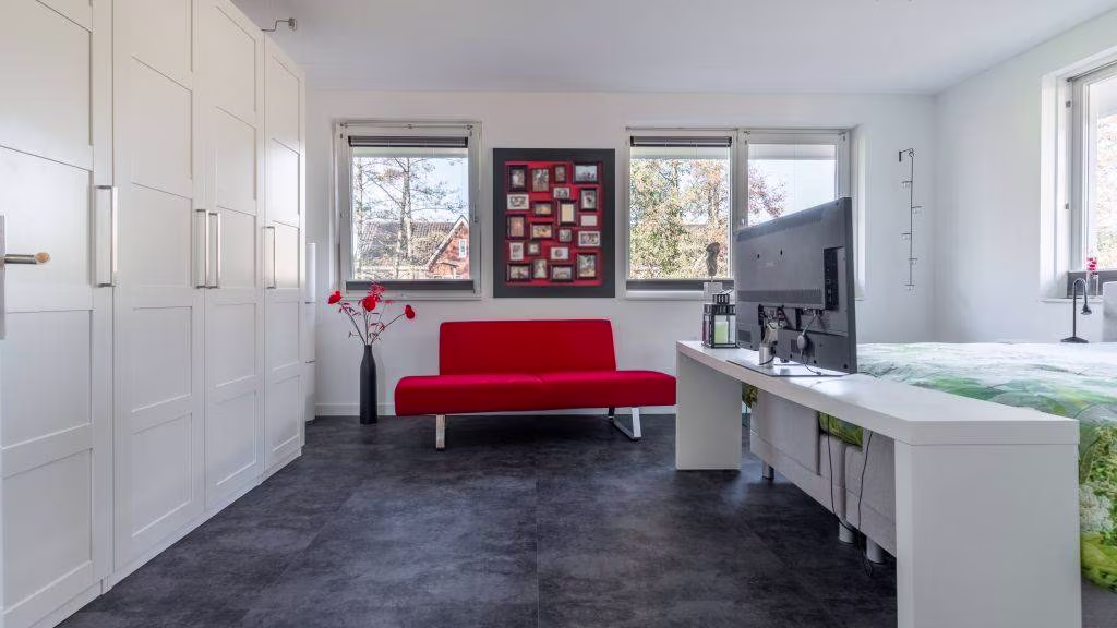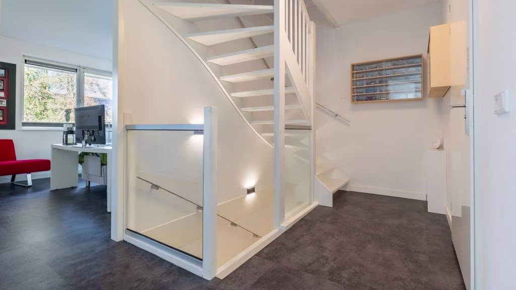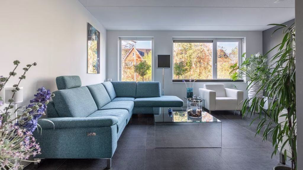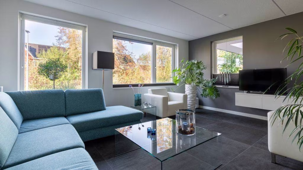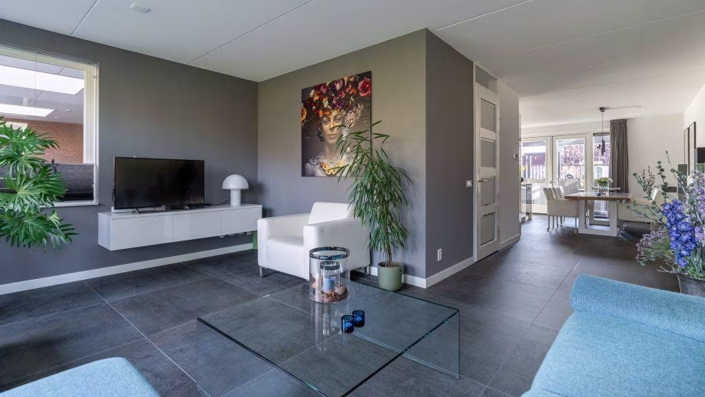De woonkamer heeft zicht op de groenstrook aan de voorzijde. Dankzij de optimale isolatie en vloerverwarming is het hier het hele jaar aangenaam. De afwerking is strak, modern en tijdloos — precies zoals je het wilt in een woning van dit niveau.