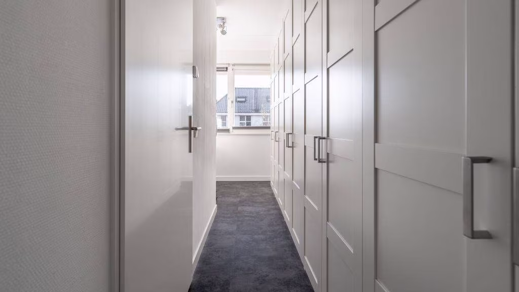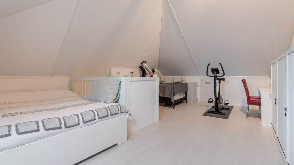 De woning beschikt over één zeer ruime slaapkamer die gemakkelijk is om te bouwen naar twee slaapkamers, verder een tweede slaapkamer die nu fungeert als kastenkamer en kantoorruimte. De tweede verdieping biedt extra mogelijkheden — ideaal als derde slaapkamer en/of werkruimte.