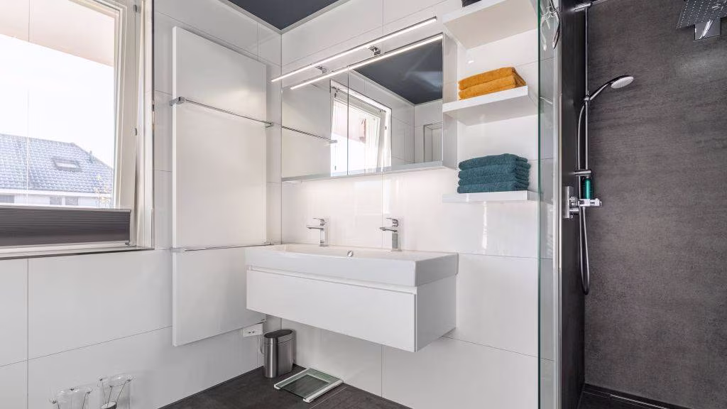 Op de verdieping tref je een badkamer die je eerder in een luxe hotelsuite zou verwachten. Hoogwaardige materialen, een royale inloopdouche, dubbele wastafel én een betoverende sterrenhemel boven het ligbad maken dit tot een plek om iedere dag van te genieten.
