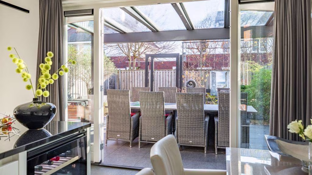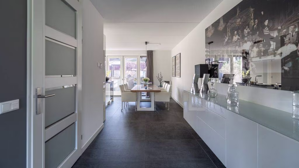 De leefkeuken vormt het hart van de woning. Een prachtige, luxe uitgevoerde ruimte met hoogwaardige Miele-apparatuur die koken tot een waar plezier maakt. De open indeling en grote raampartijen zorgen voor een lichte, warme sfeer — de ideale plek voor lange avonden tafelen of een koffiemoment aan het eiland.