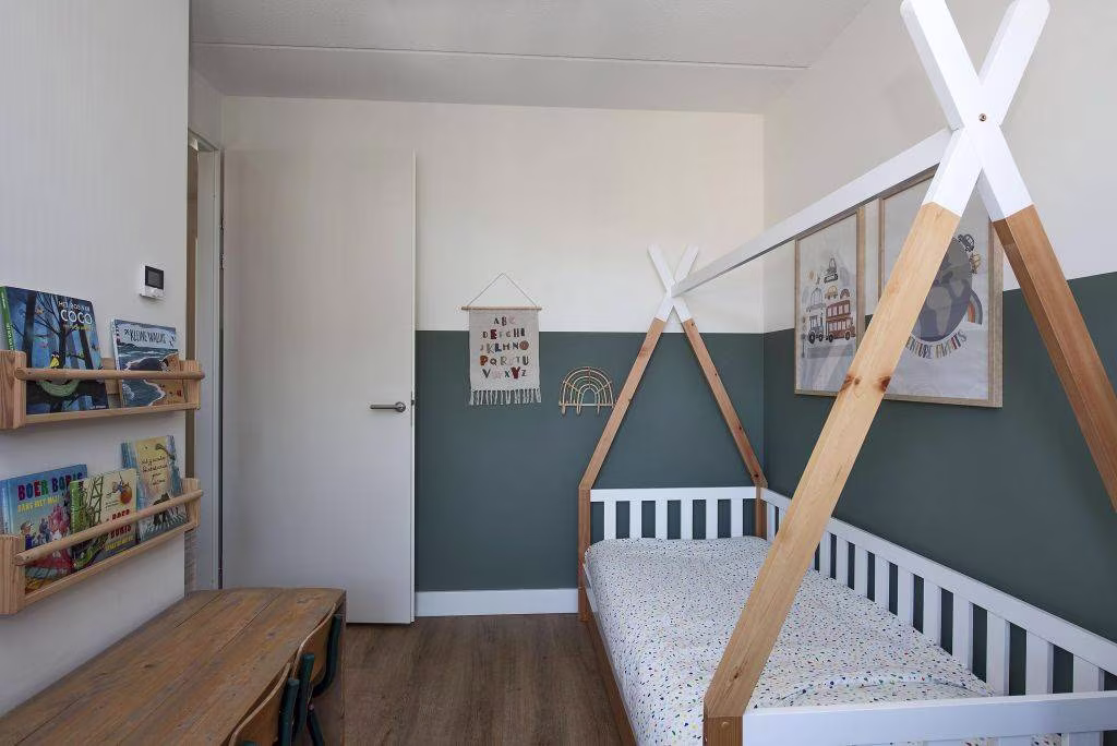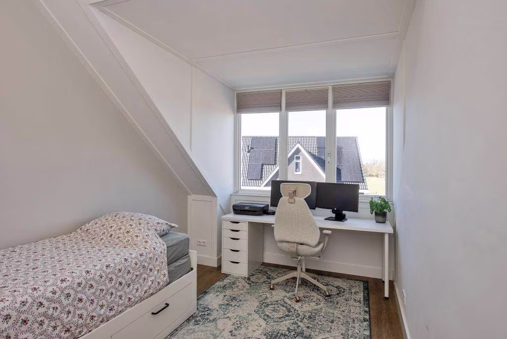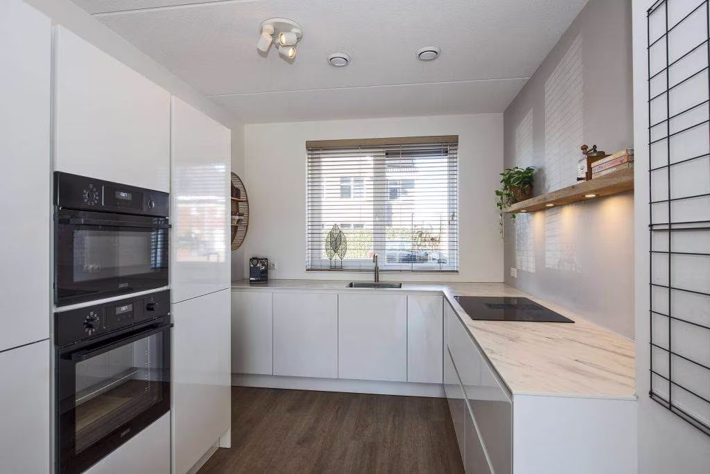 Binnen valt meteen de lichte en ruime woonkamer op, compleet met een fraaie vakkenkast die extra sfeer en opbergruimte biedt. De open keuken, uitgevoerd in een lichte kleur, is voorzien van inbouwapparatuur. Op de bovenverdiepingen bevinden zich vier ruime slaapkamers, perfect voor kinderen, werk of hobby, en een luxe badkamer.