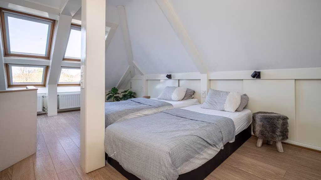 Middels vaste trap naar ruime zolderkamer met dakvensters, dakkapel, vaste kast met opstelplaats cv-ketel en veel bergruimte achter de schuine kanten.
