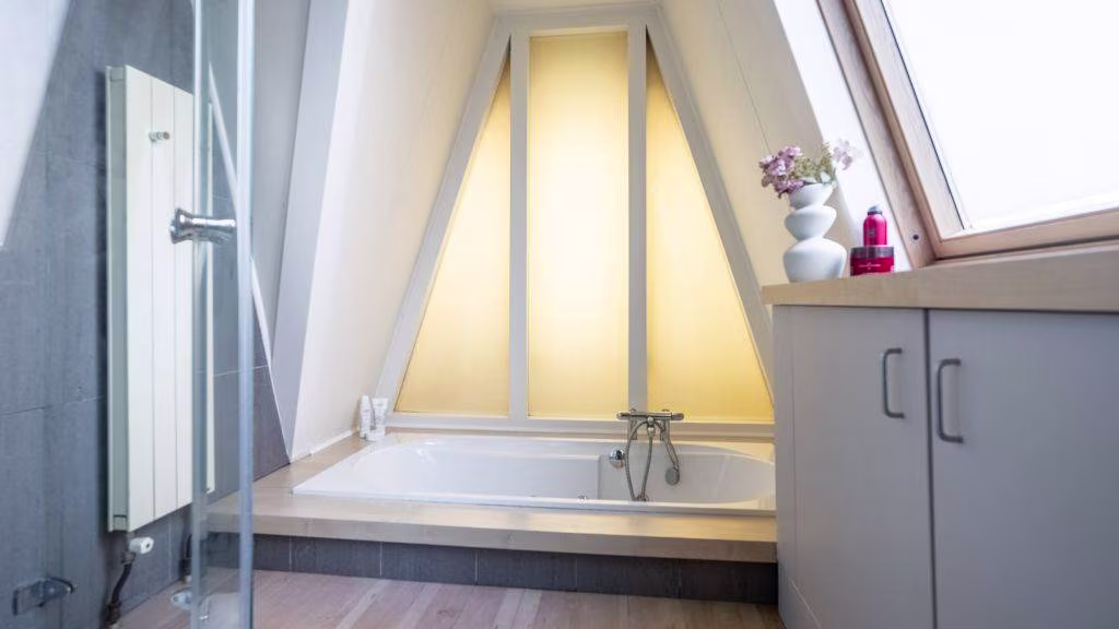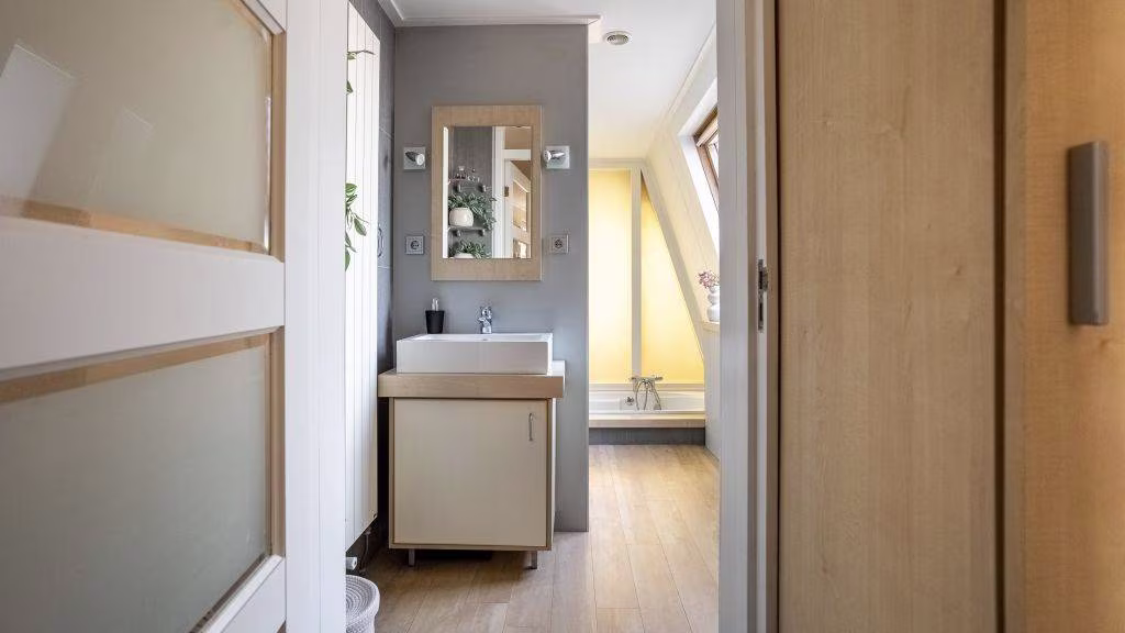 Overloop met toegang tot drie slaapkamers met vaste kasten, ruime badkamer met ligbad, wastafelmeubel, douche en toilet.