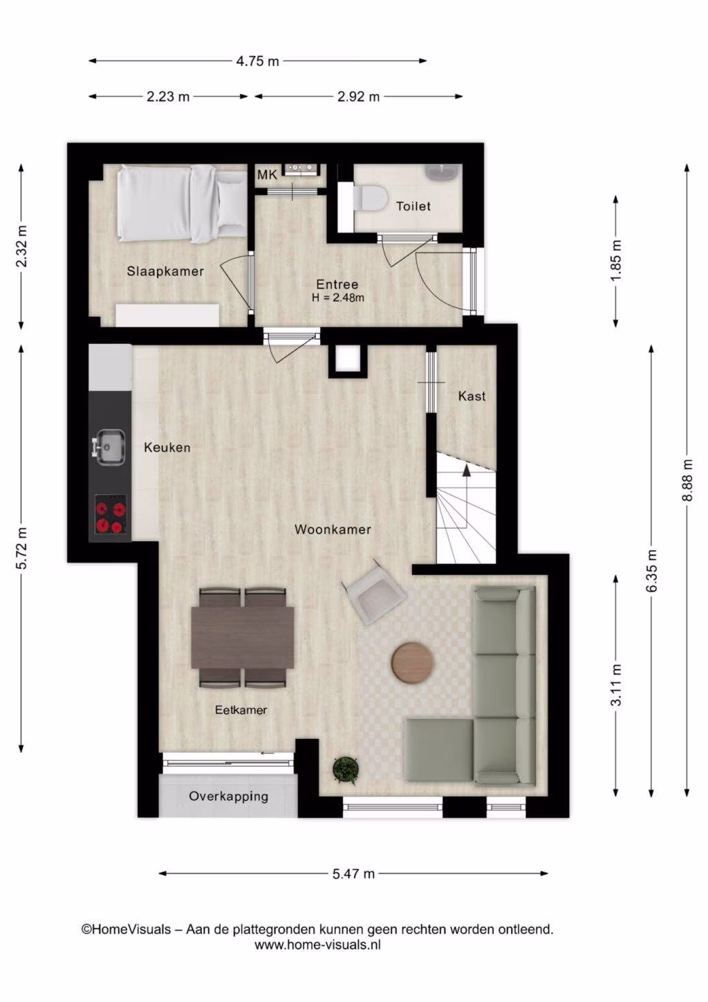 Wanneer je het appartement binnenkomt, sta je in de hal met toegang tot het toilet, de berging en de woonkamer met open keuken. Vanuit de woonkamer is het terras te bereiken. Via de trapopgang in de woonkamer kun je naar de tweede woonlaag.