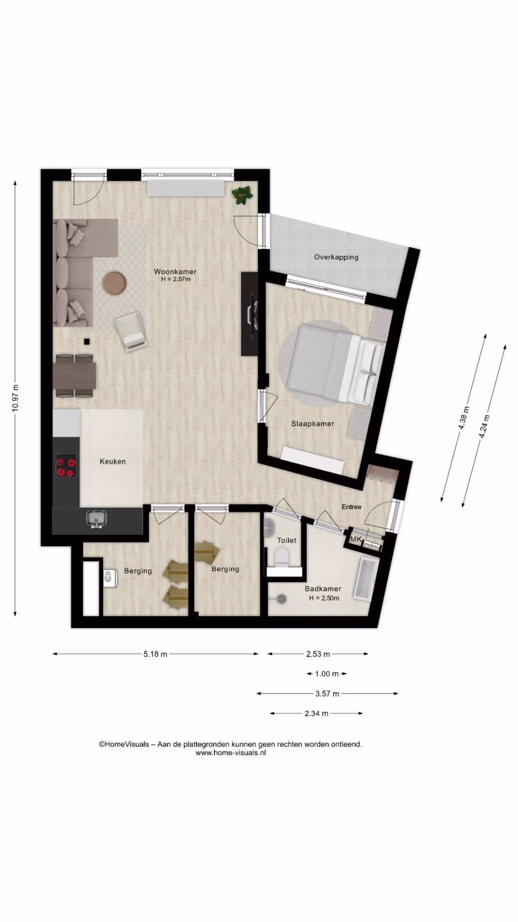 Wanneer je het appartement binnenkomt, sta je in de hal met toegang tot de moderne badkamer, het aparte toilet en de woonkamer met keuken. Vanuit de woonkamer kun je doorlopen naar de bijkeuken, de berging, de loggia en de slaapkamer.