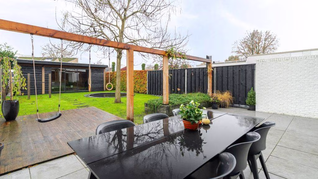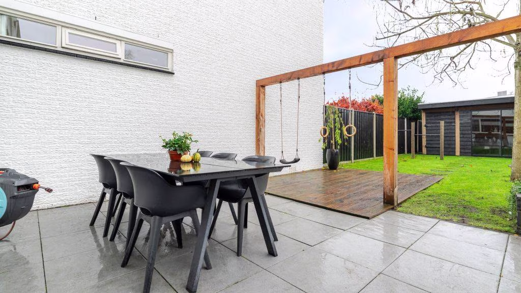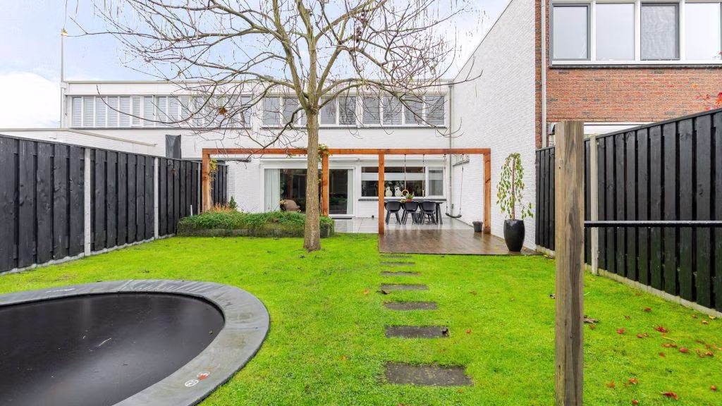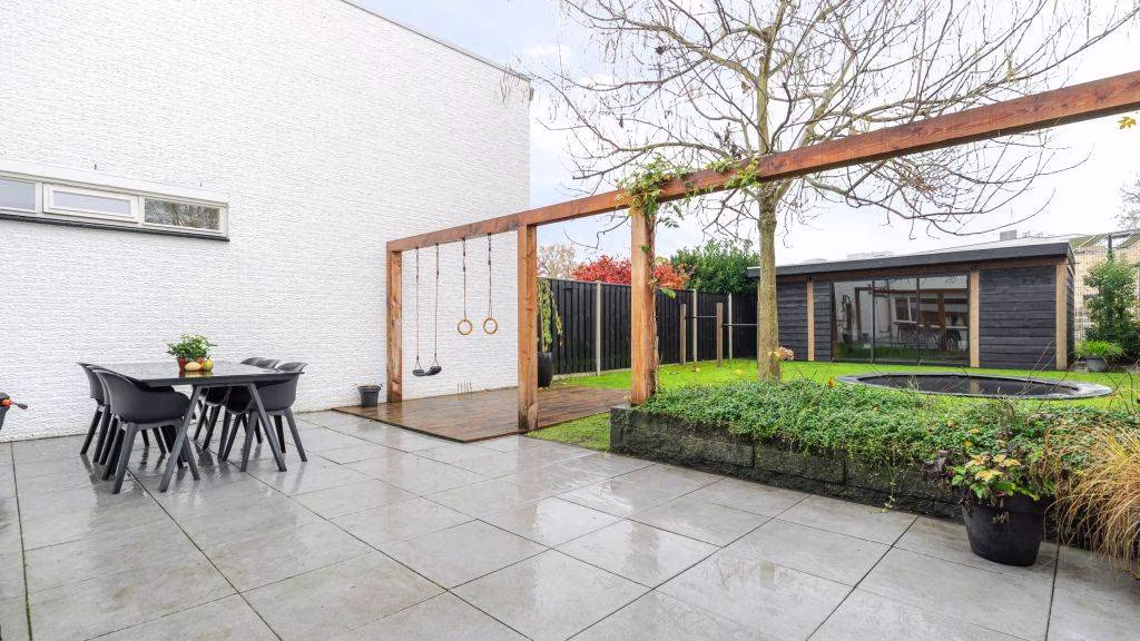 De fraai aangelegde achtertuin ligt op het zuidwesten, waardoor je de hele dag door volop zon hebt. De overkapping uit 2020 met berging biedt een heerlijke plek om tot laat buiten te zitten, in alle seizoenen. De tuin is onderhoudsvriendelijk en biedt veel privacy.