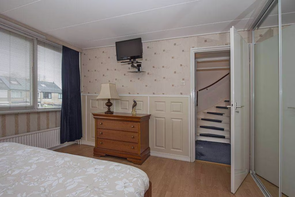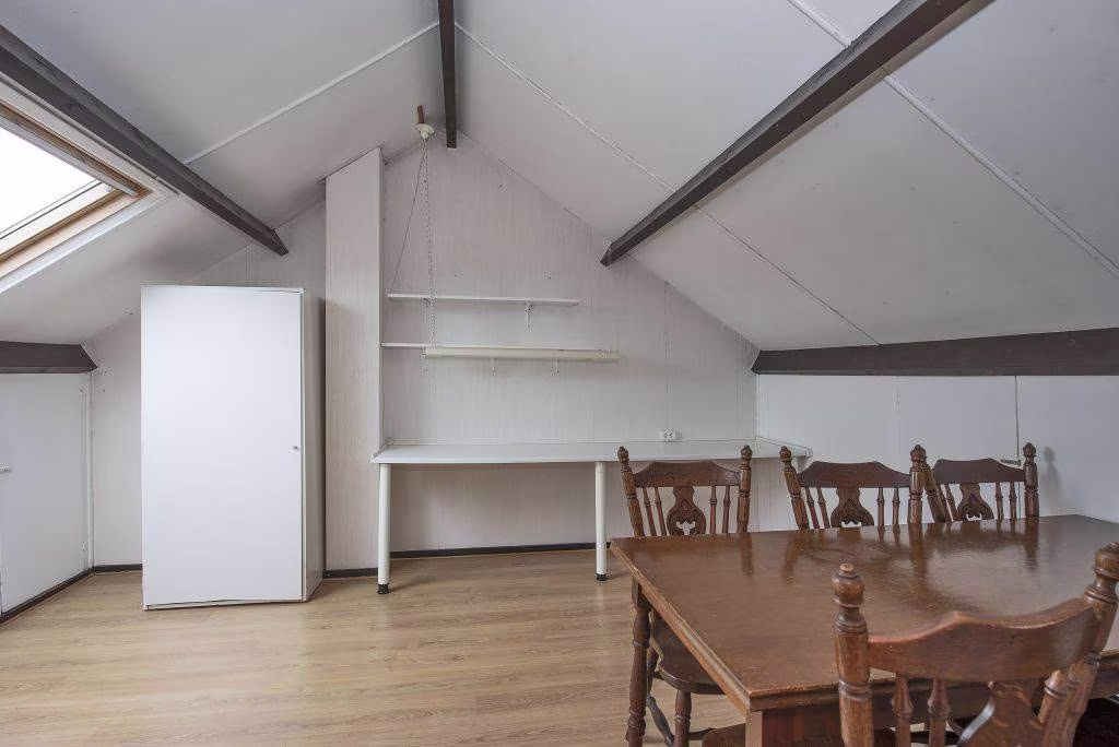 De tweede verdieping is een verrassing: een royale zolderkamer met dakraam en handige bergruimte achter de knieschotten. Nu ingericht als slaapkamer, maar net zo geschikt als werkplek, hobbyruimte of logeerkamer. Jij bepaalt wat hier het beste past.