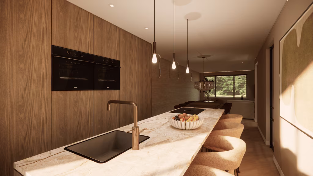 Vanuit de woonkamer bereik je de tussenhal met toiletruimte en fonteintje. En aansluitend aan de keuken bevindt zich de bijkeuken met wasmachine- en drogeraansluiting en de cv-installatie (Bosch, 2024).