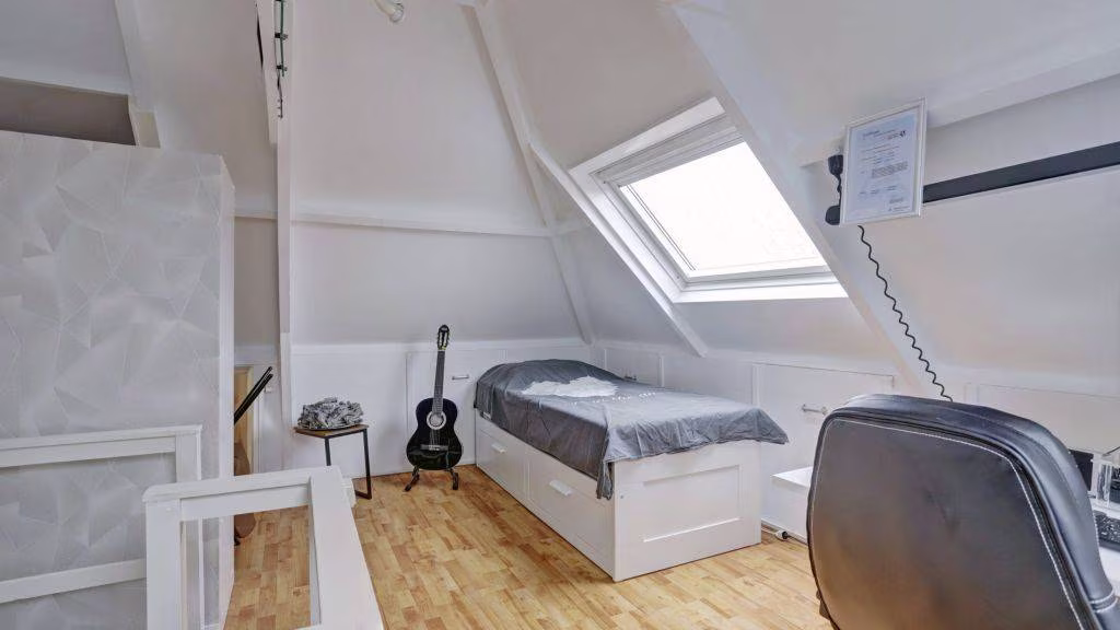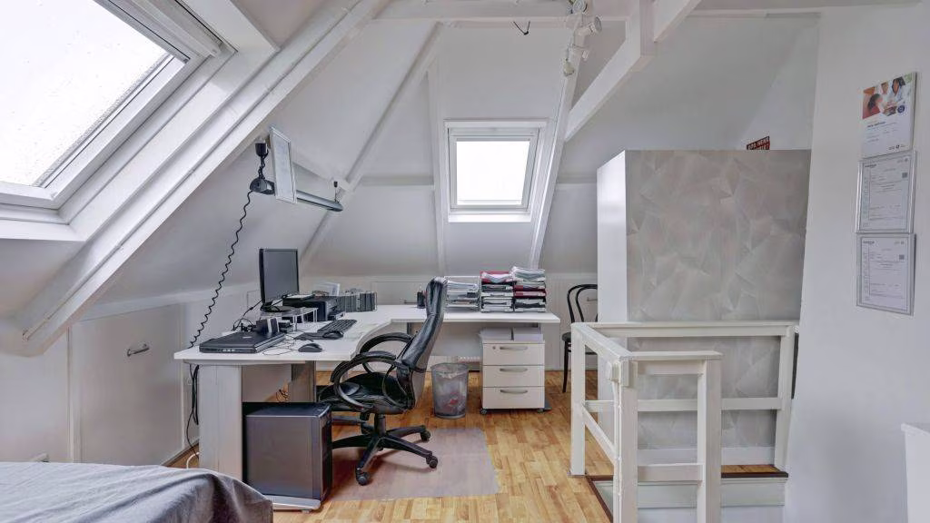 Middels vaste trap te bereiken grote kantoorruimte welke prima te realiseren is als derde slaapkamer.