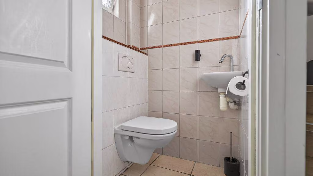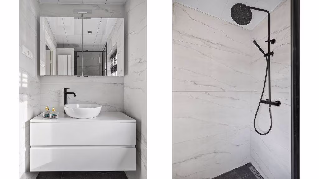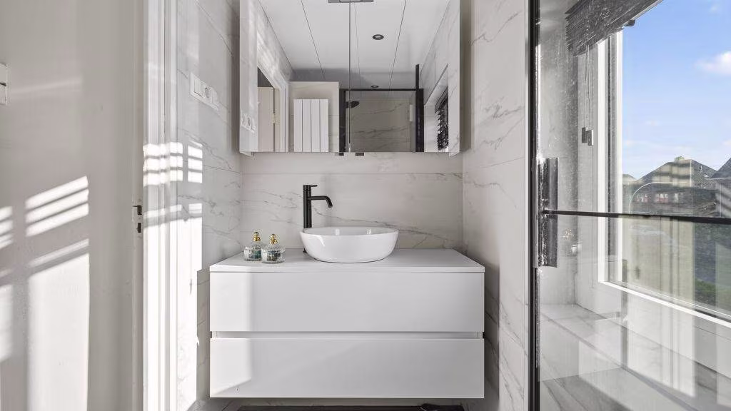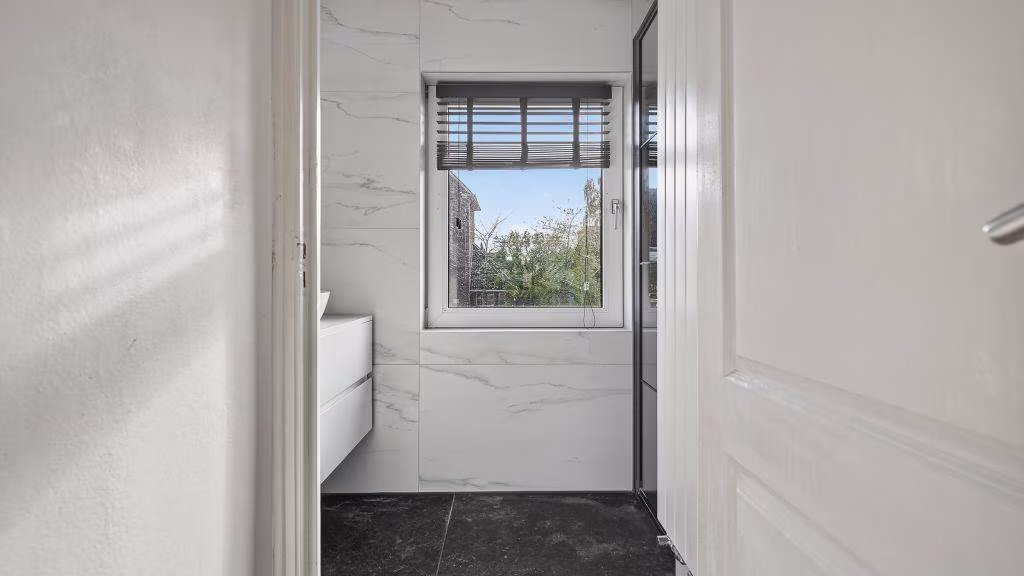 Overloop naar drie slaapkamers en badkamer welke is voorzien van inloopdouche en wastafel.