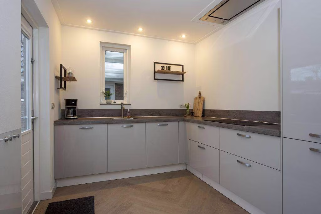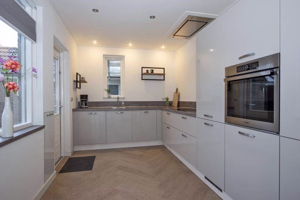 - Inbouwapparatuur keuken: 4-pits keramische kookplaat, elegante plafond afzuigkap met extra sterke motor, oven, vaatwasser en koelkast en vrieskast op praktische hoogte;