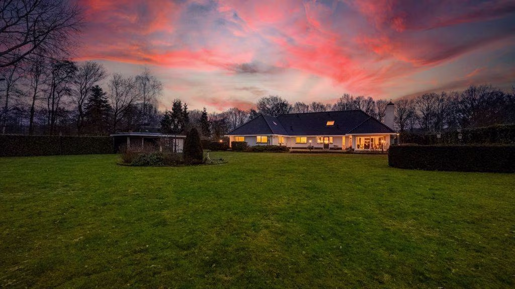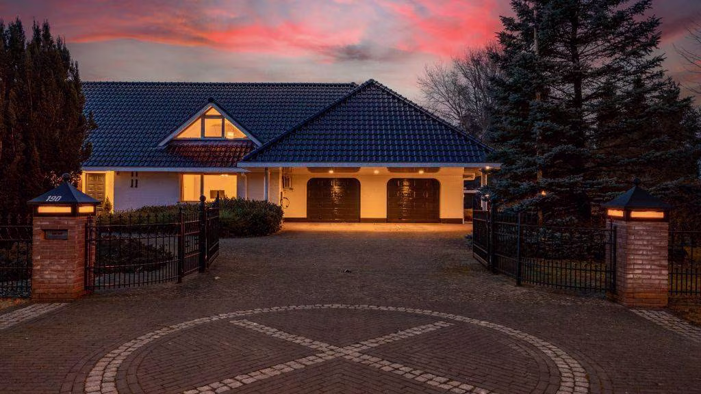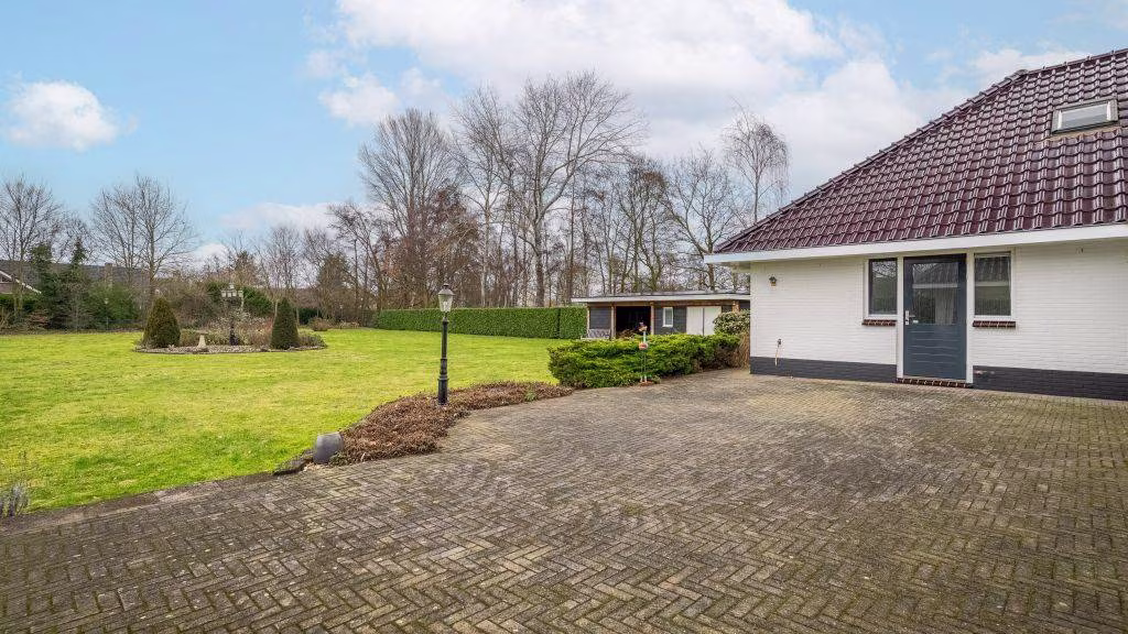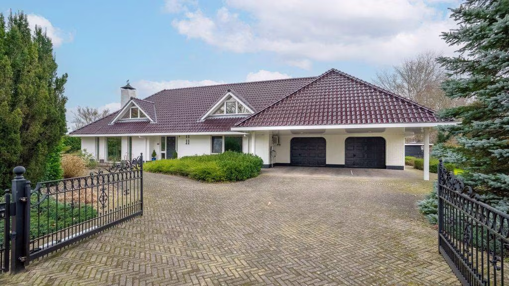 De woning beschikt over een dubbele inpandige garage met dubbele elektrische deuren, een dubbele carport én elektrisch bedienbare toegangspoorten. Parkeren kan hier ruimschoots op eigen terrein.