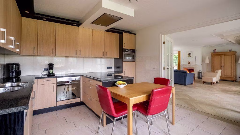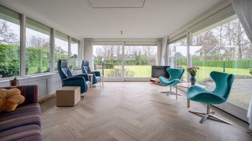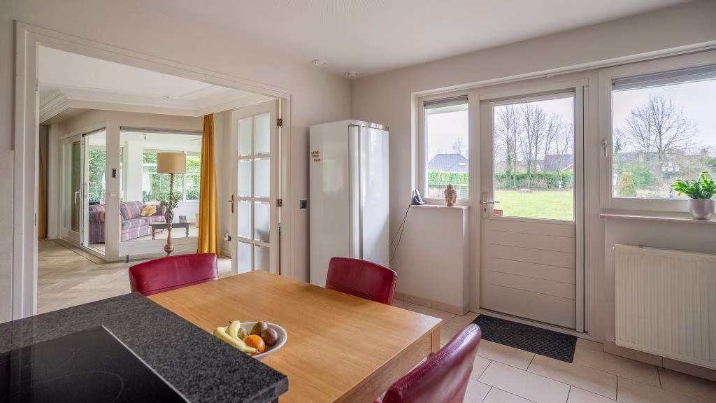 De royale, lichte woonkamer is voorzien van een prachtige in visgraat gelegde pvc-vloer en een sfeervolle haard, wat zorgt voor een warme en stijlvolle uitstraling. Grote raampartijen bieden een prachtig uitzicht op de groene tuin en laten het daglicht rijkelijk binnenstromen. De aangrenzende tuinkamer vormt een heerlijke plek om het hele jaar door te genieten van het uitzicht over de fraai aangelegde achtertuin. Binnen en buiten lopen hier naadloos in elkaar over.