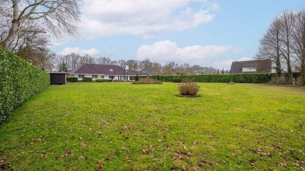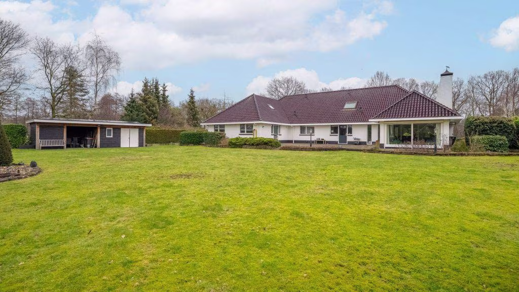 De royale achtertuin met zonnig terras biedt optimale privacy en beschikt over een overkapping en een houten berging. Het royale perceel van bijna 4.000 m² zorgt voor een oase van rust en ruimte – een zeldzame combinatie met de ligging aan het kanaal en het omliggende groen.