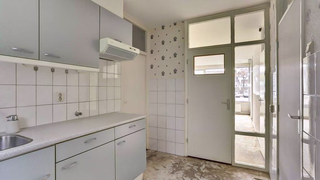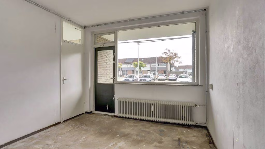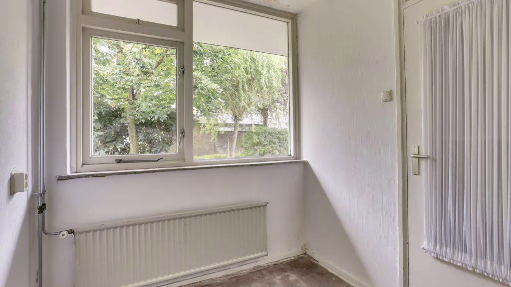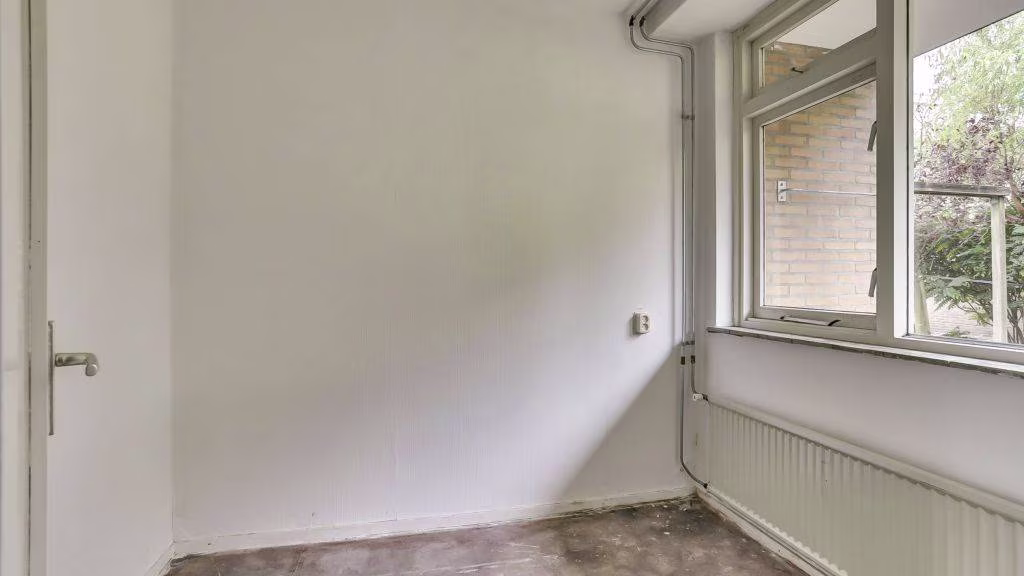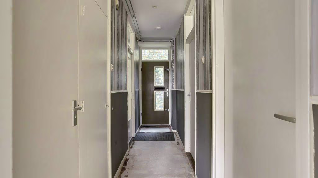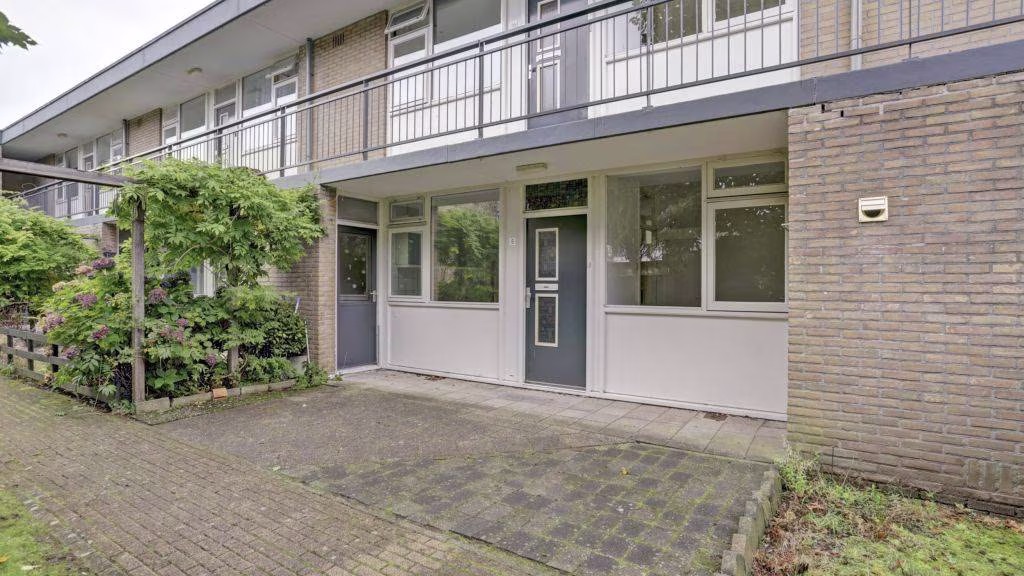 Entree/hal, toegang tot twee slaapkamers, badkamer en keuken. Vanuit de keuken is de berging te bereiken waar zich ook de aansluitingen voor de wasmachine en droger bevinden. Vanuit de hoofdslaapkamer is het achter terras te bereiken, de woonkamer is gelegen aan het gemeentelijke groen.